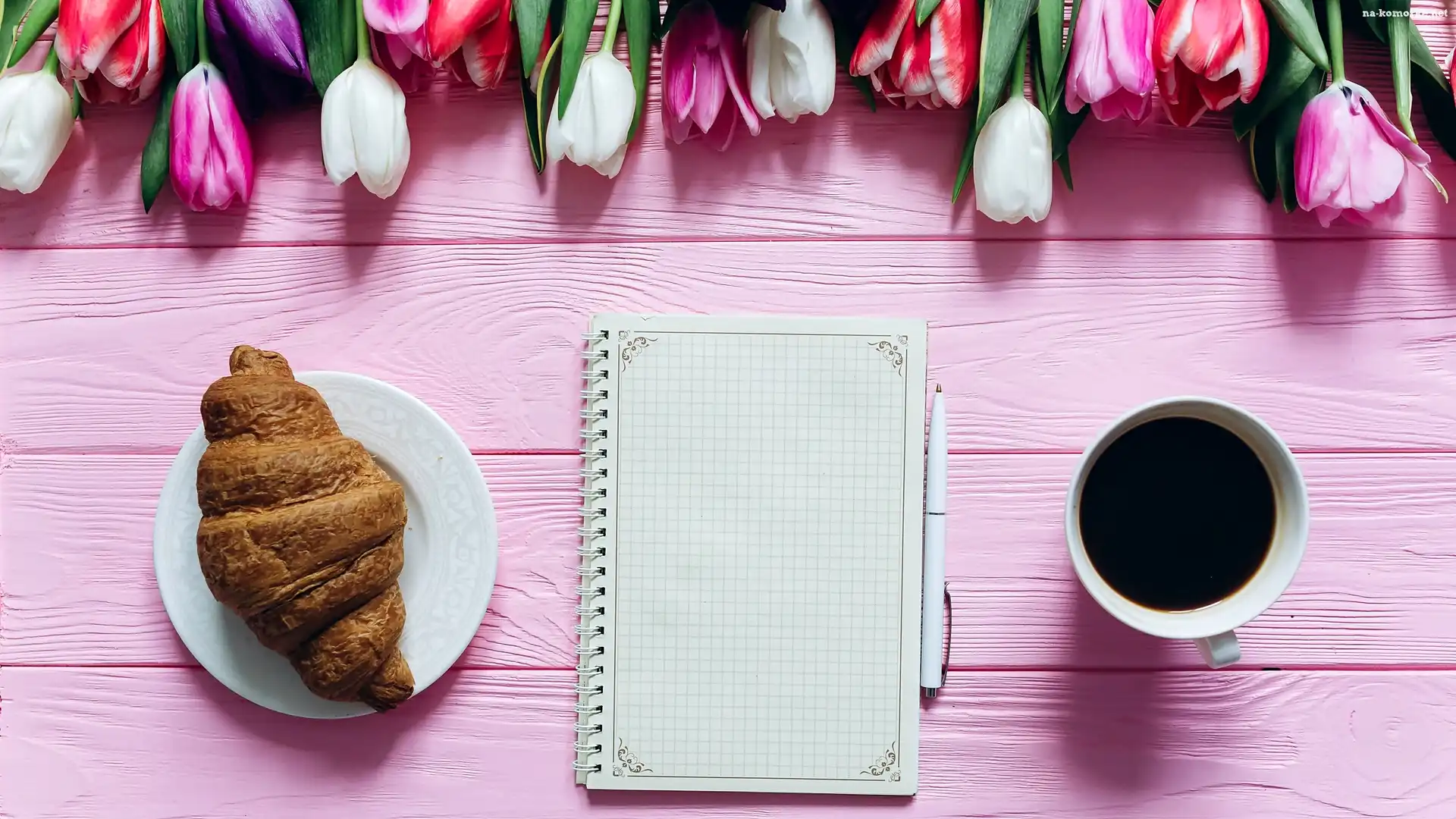 Croissant, Tulipany, Długopis, Talerzyk, Deski, Rogal, Różowe, Notes, Kawa na Komórkę