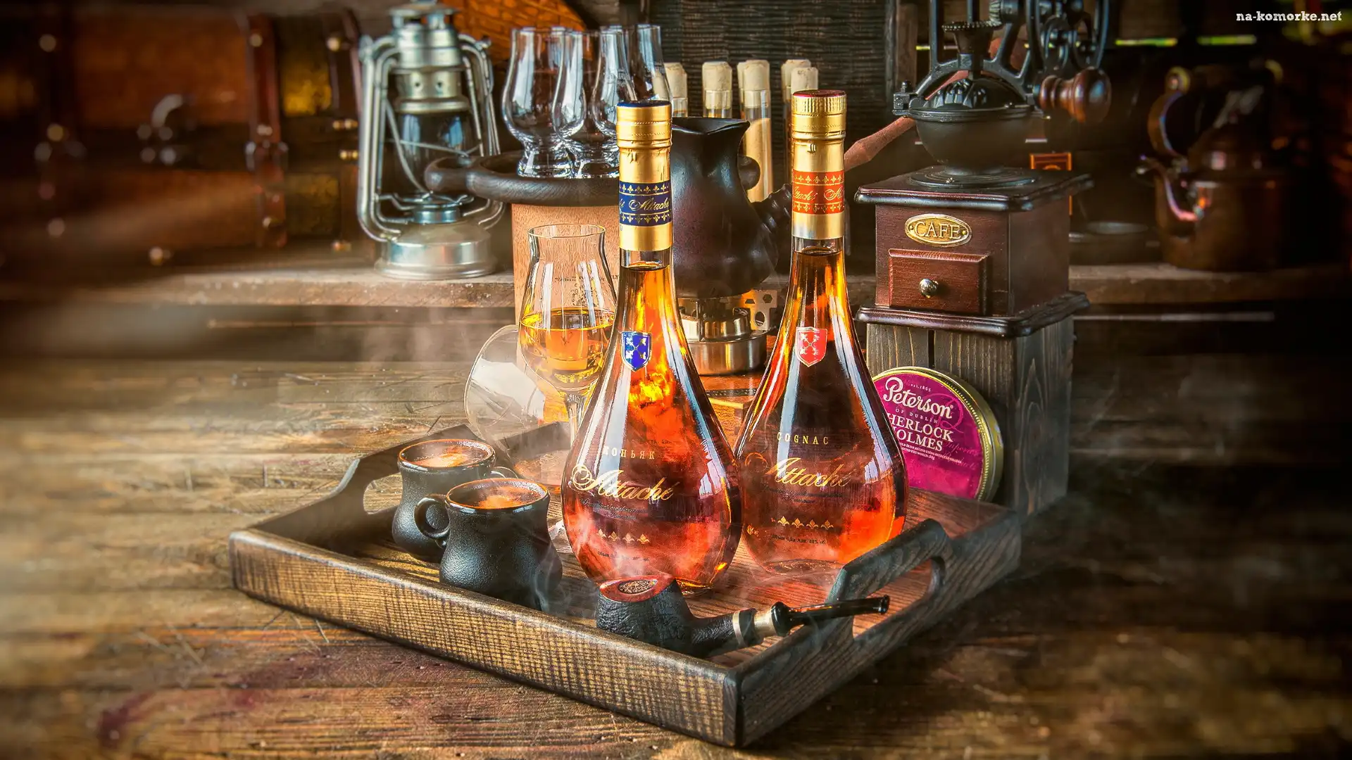 Kompozycja, Kawa, Młynek, Butelki, Koniak, Kieliszki, Taca na Komórkę