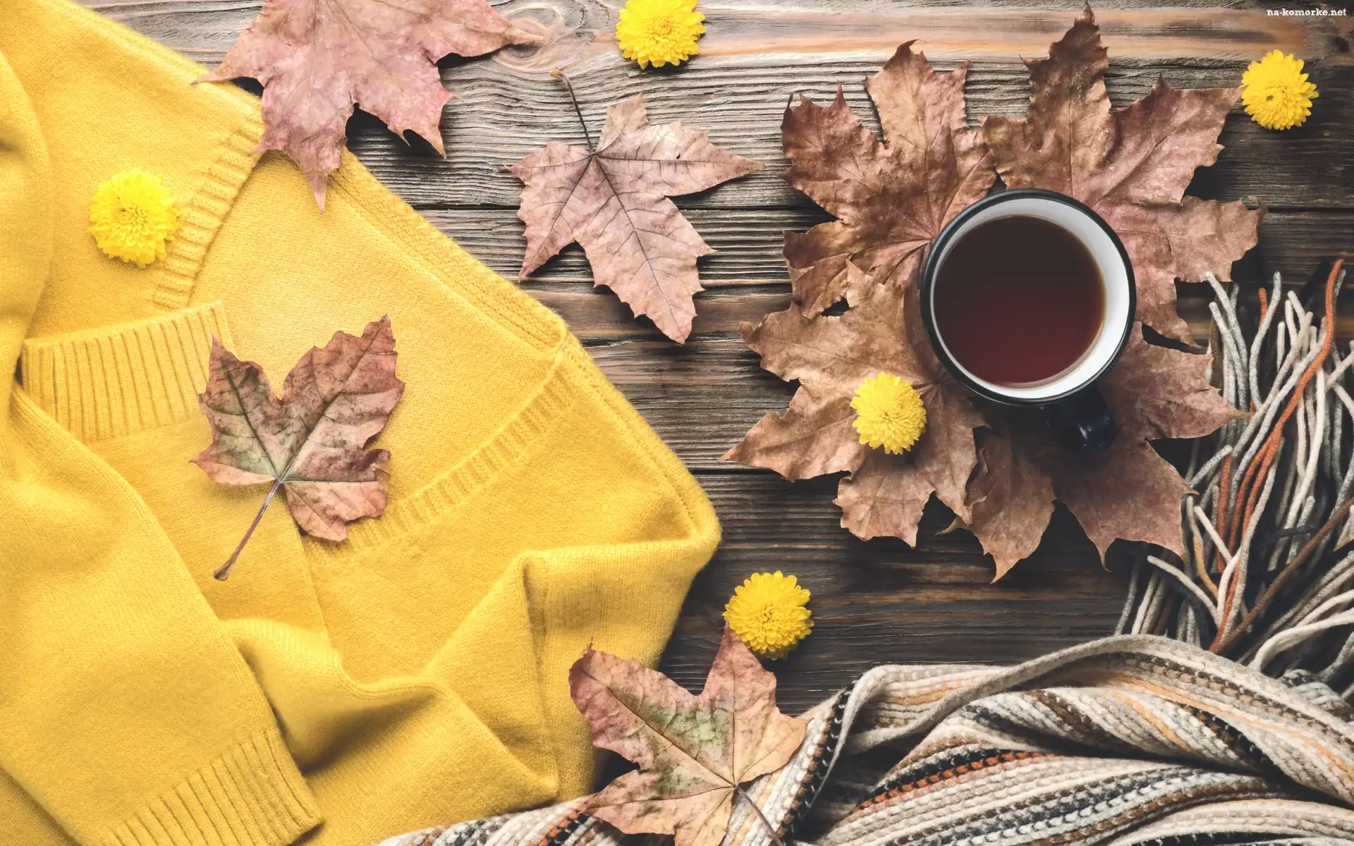 Jesienna, Liście, Kawa, Kompozycja, Szalik, Żółte, Żółty, Kubek, Sweter, Klonu, Kwiaty na Komórkę |