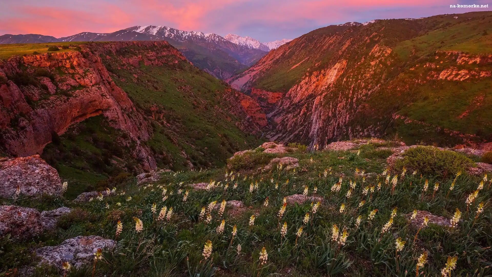 Zachód słońca, Kazachstan, Rezerwat przyrody Aksu-Zhabagly, Kanion rzeki Aksu, Góry na Komórkę