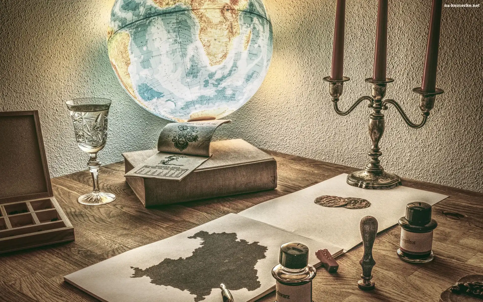 Świecznik, Lampa, Kalendarz, Rysunek, Kompozycja, Globus, Książka, Stół, Kieliszek na Komórkę |