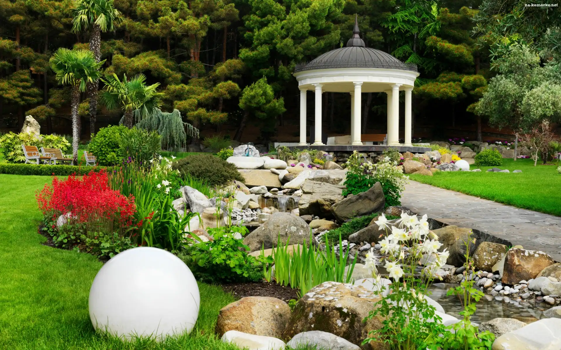 Klomby, Park, Strumyk, Kwiaty, Kamienie na Komórkę