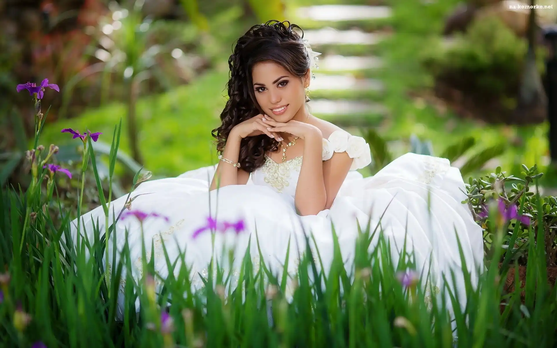Kobieta, Kwiaty, Biała, Suknia na Komórkę