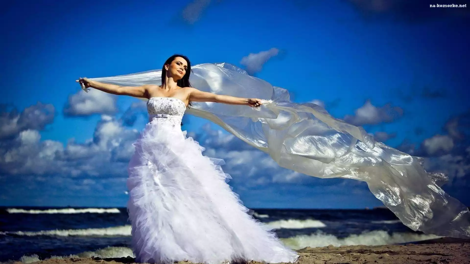 Kobieta, Morze, Biała, Suknia na Komórkę