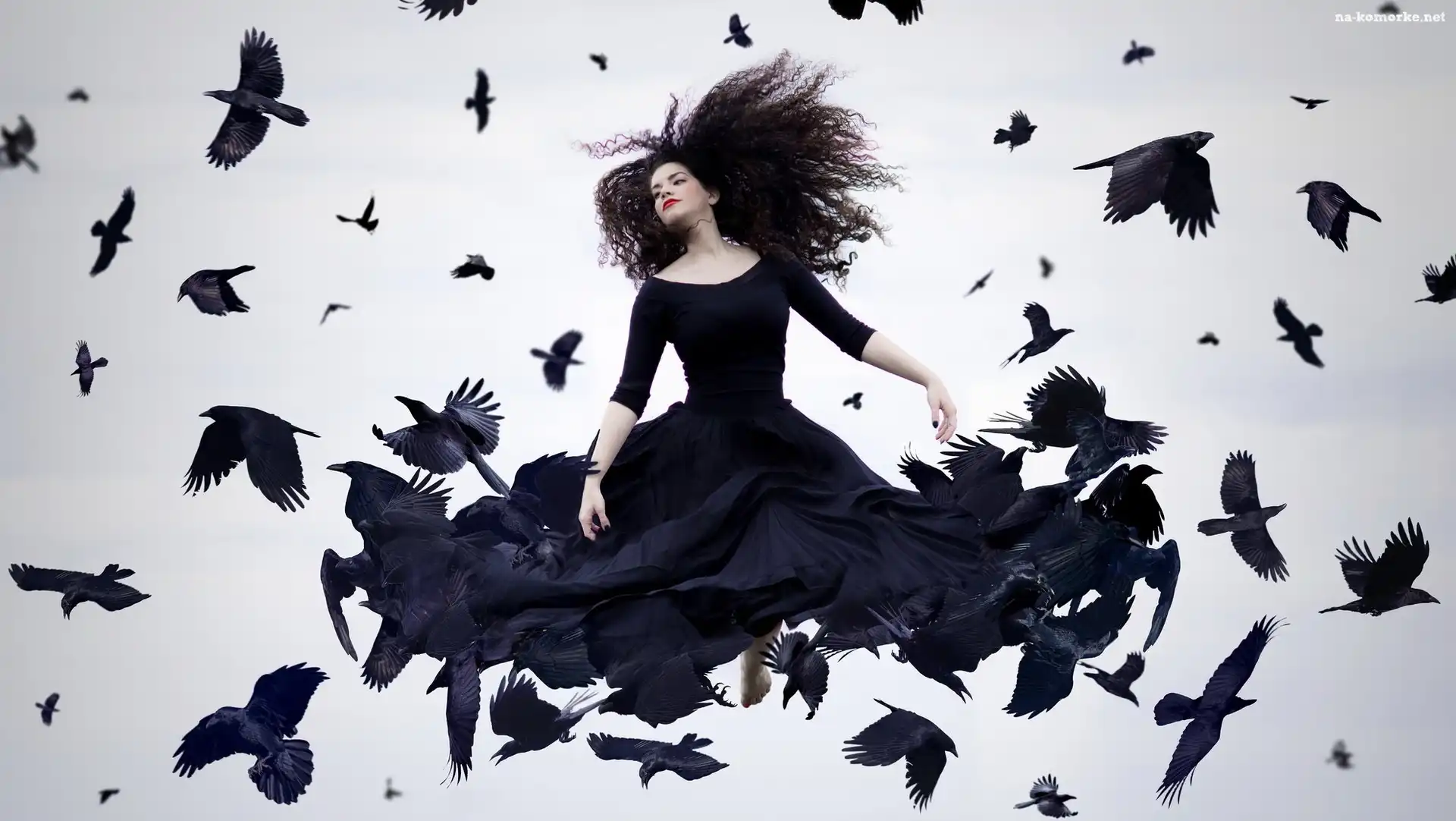 Kobieta, Kruki, Czarna, Suknia na Komórkę