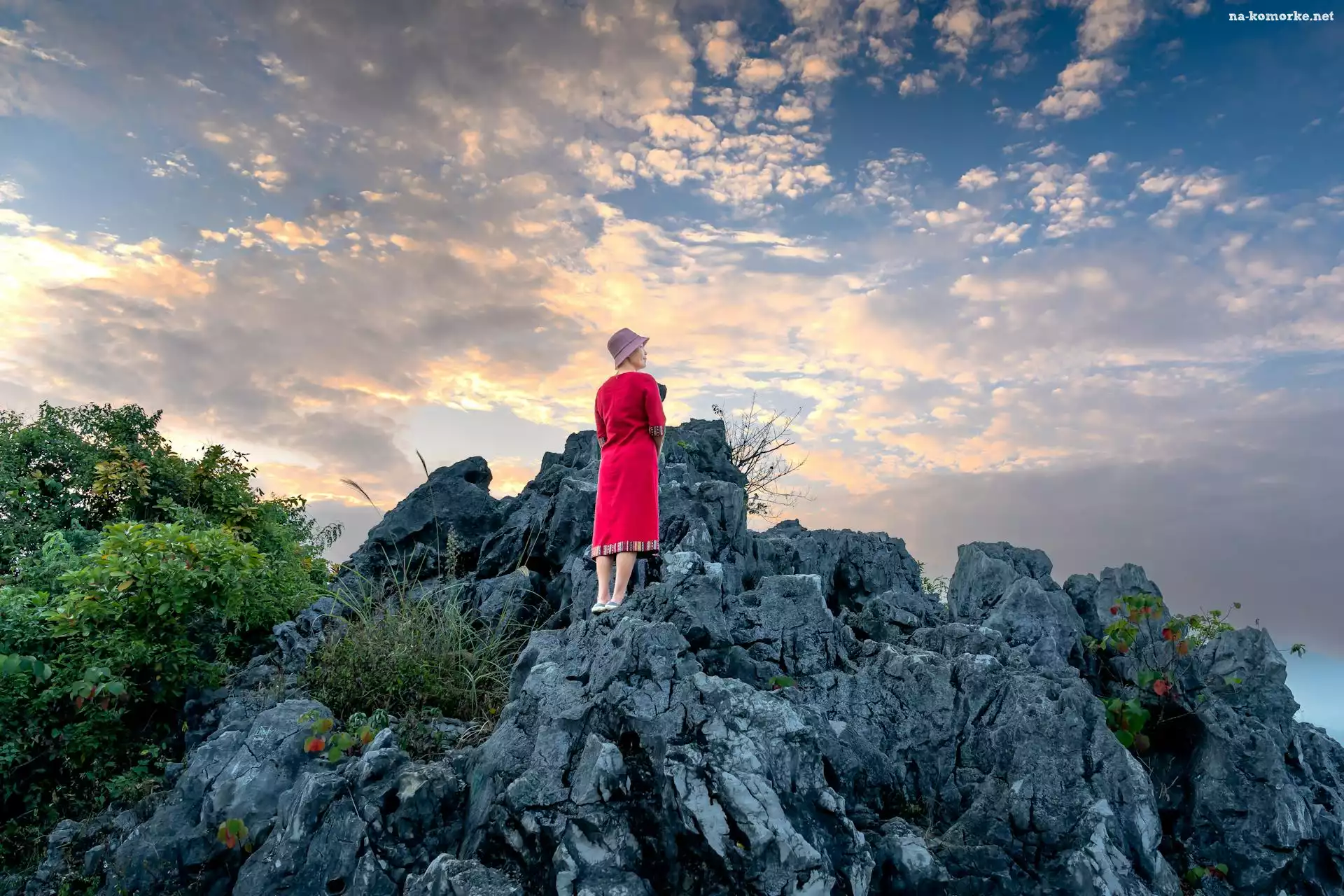 Czerwona, Sukienka, Skały, Kobieta na Komórkę