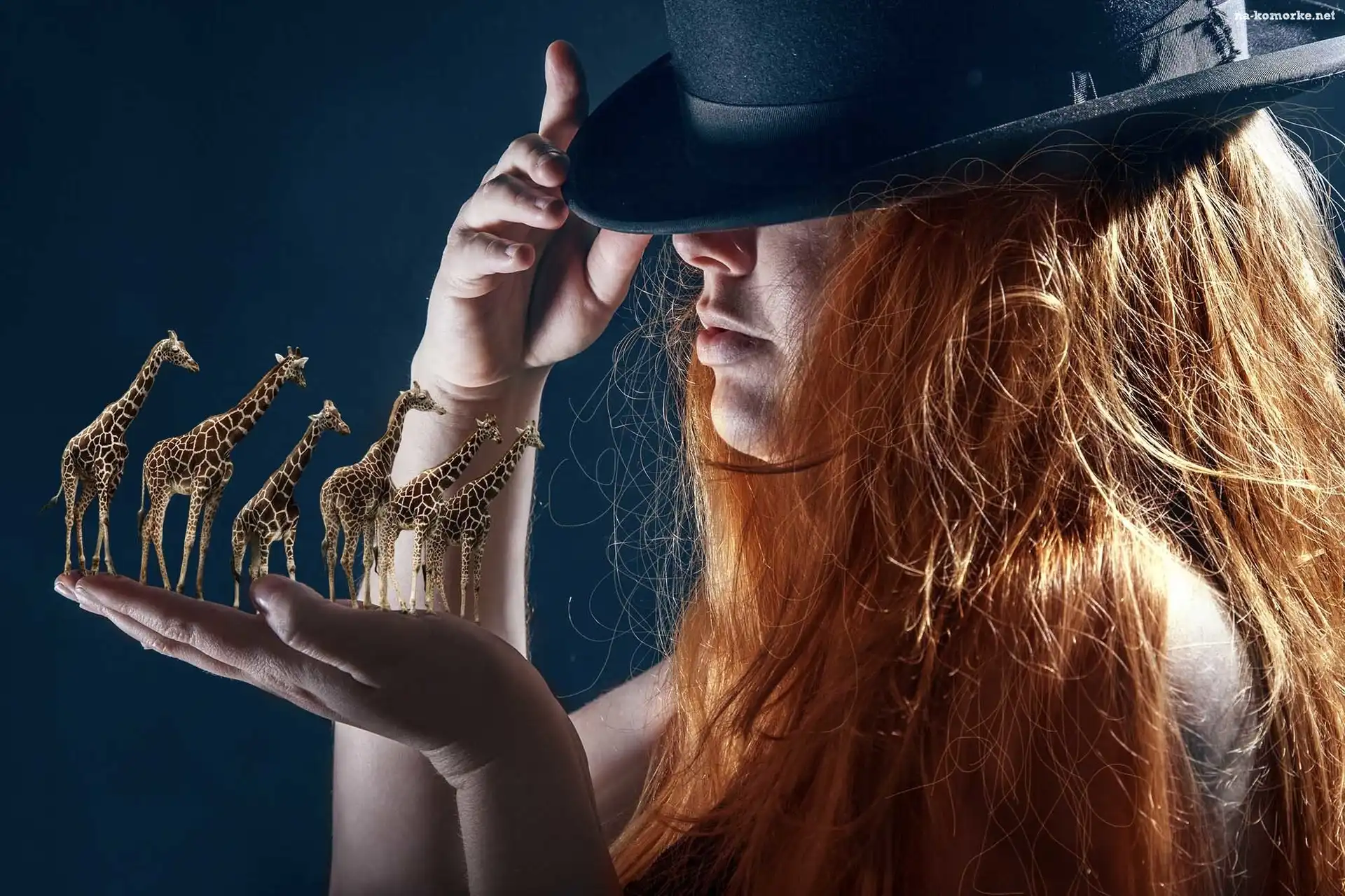 Kobieta, Żyrafy, Kapelusz, Dłoń na Komórkę