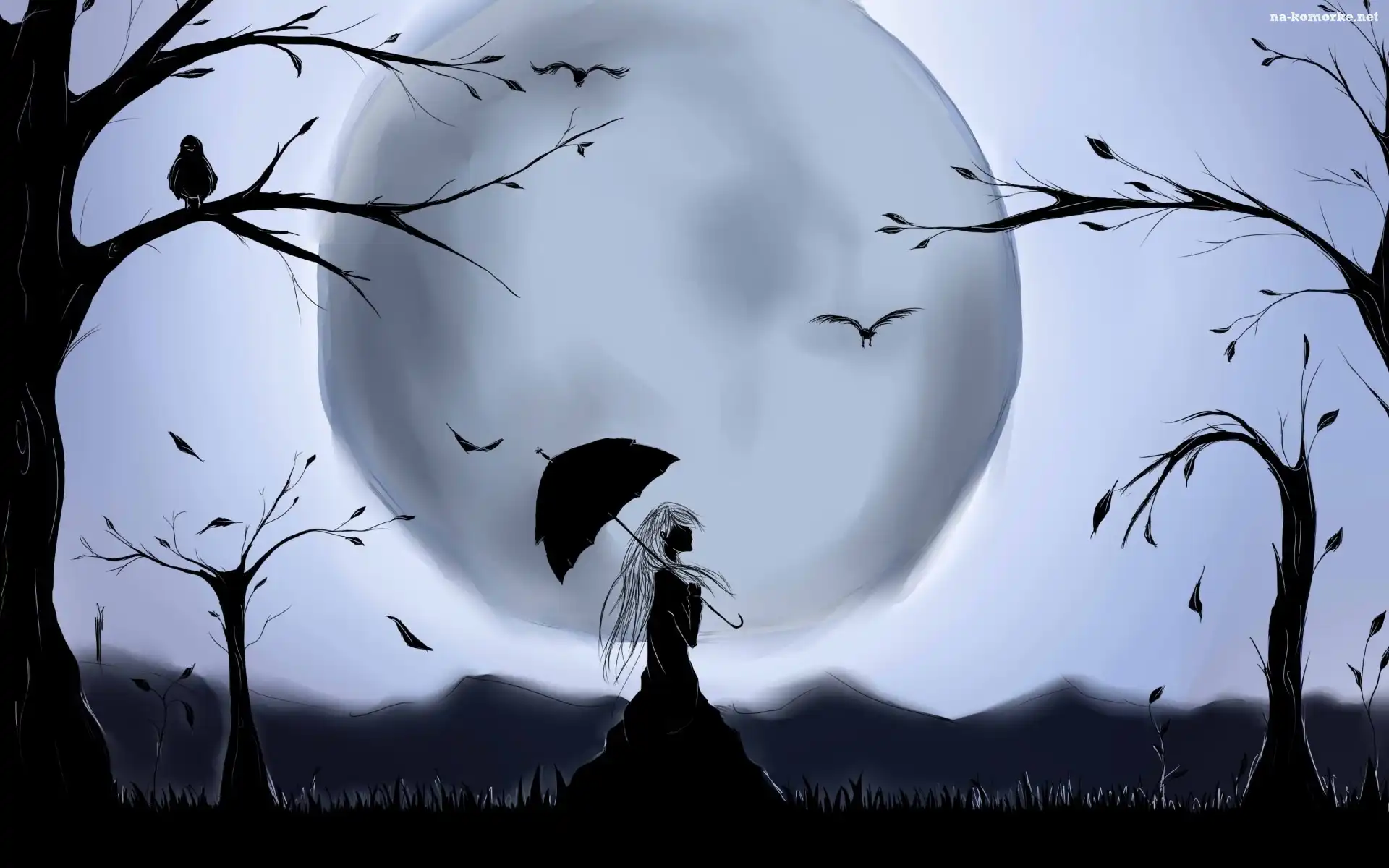 Księżyc, Drzewa, Kobieta, Parasol na Komórkę