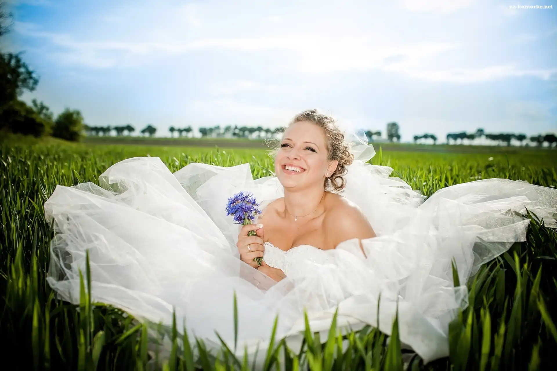 Kobieta, Łąka, Ślubna, Suknia na Komórkę
