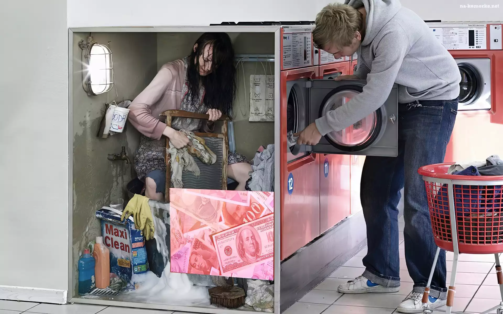 Pralka, Kobieta, Mężczyzna na Komórkę