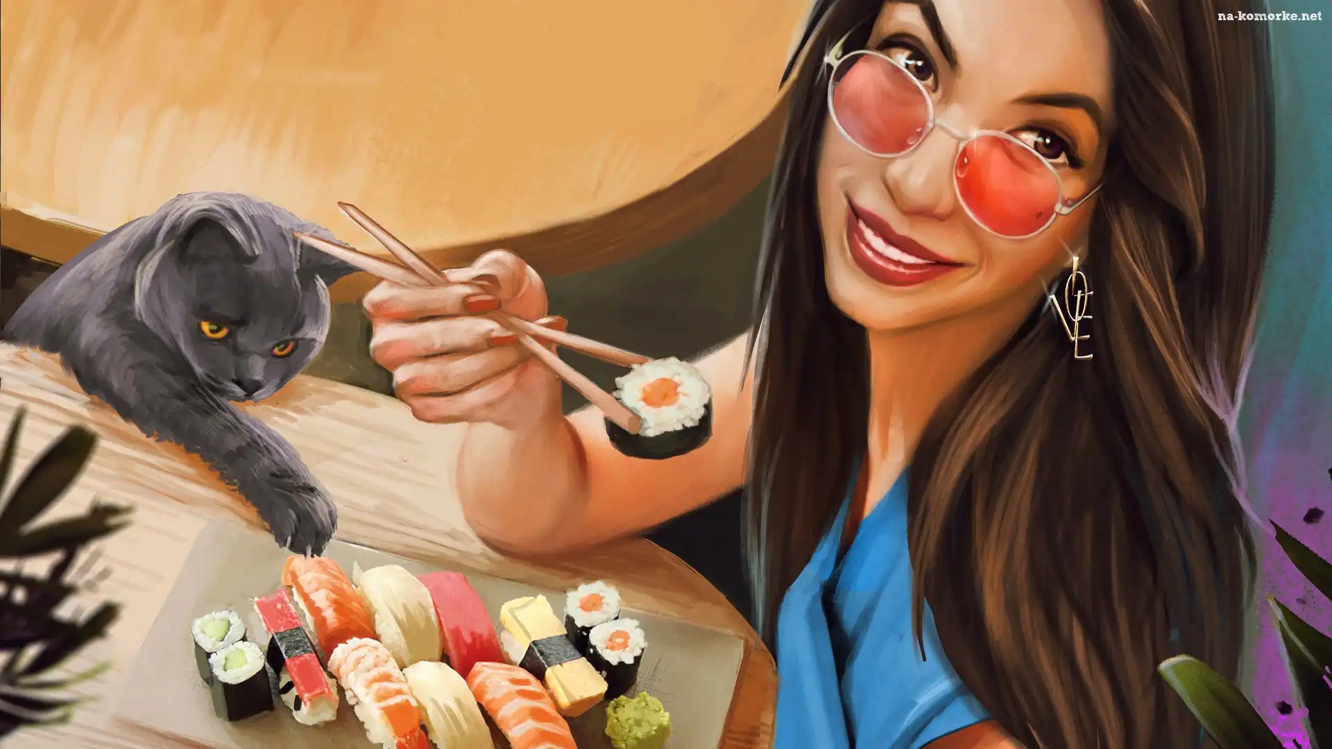 Kobieta, Grafika, Sushi, Kot na Komórkę