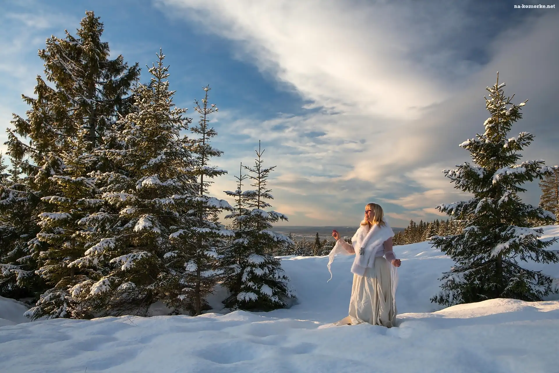 Kobieta, Drzewa, Zima, Las na Komórkę