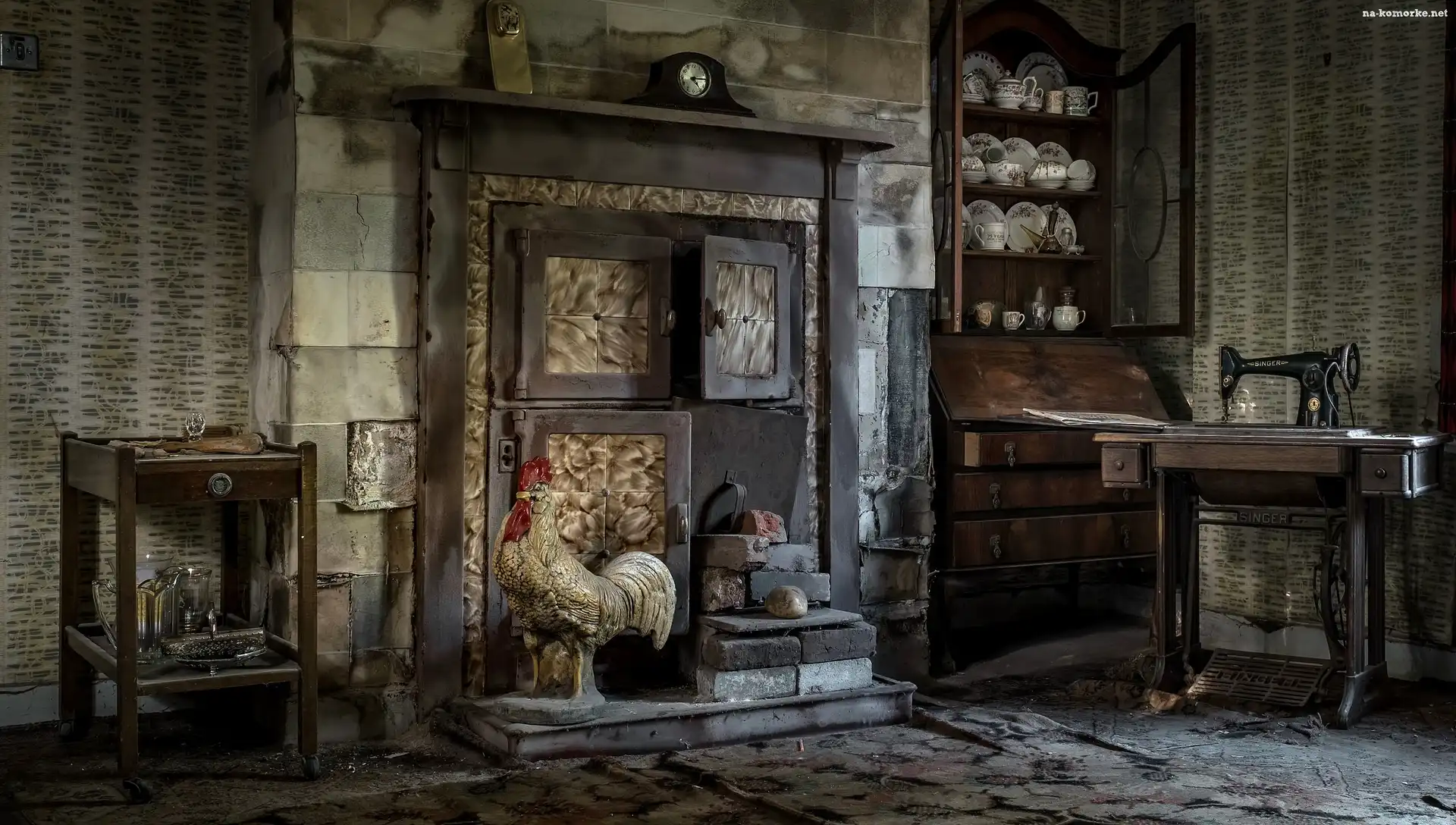 Zaniedbane, Stare, Piec, Meble, Wnętrze, Maszyna do szycia, Figurka, Kogut na Komórkę