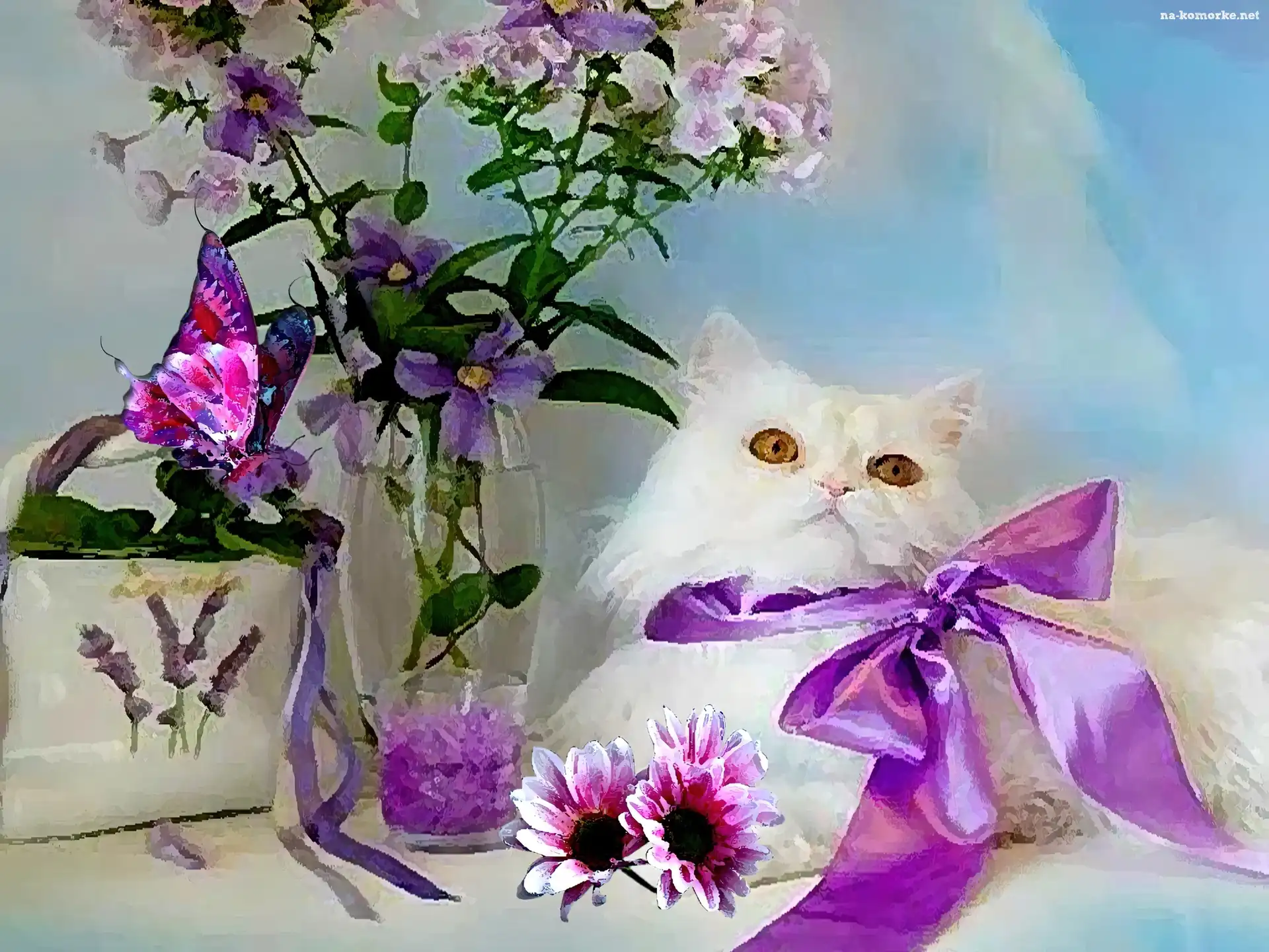 Kokarda, Kot, Biały, Obraz, Fioletowa, Kwiaty na Komórkę
