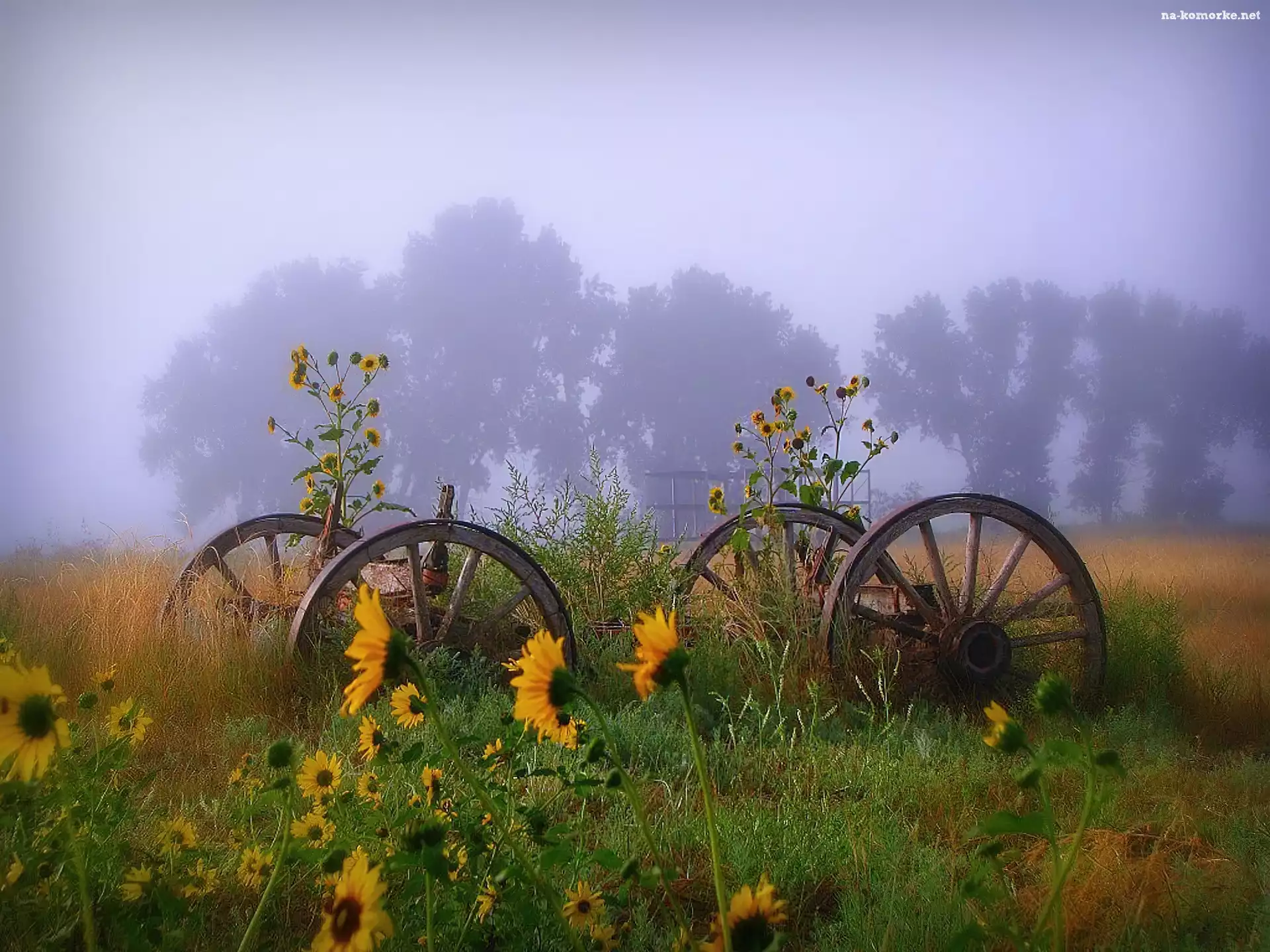 Koła, Mgła, Wóz, Słoneczniki na Komórkę