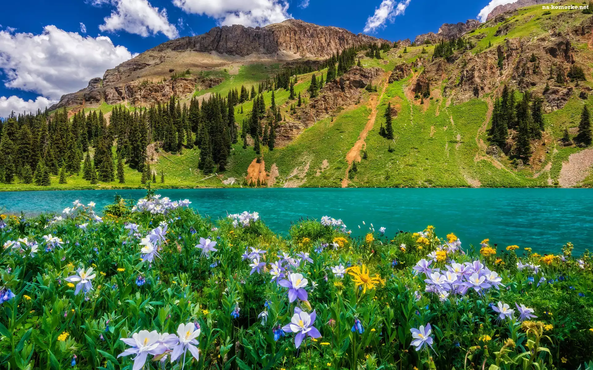 Sneffels Range, Góry, Stany Zjednoczone, San Juan Mountains, Niebo, Łąka, Jezioro, Blue Lake, Drzewa, Kwiaty, Lato, Kolorado na Komórkę |