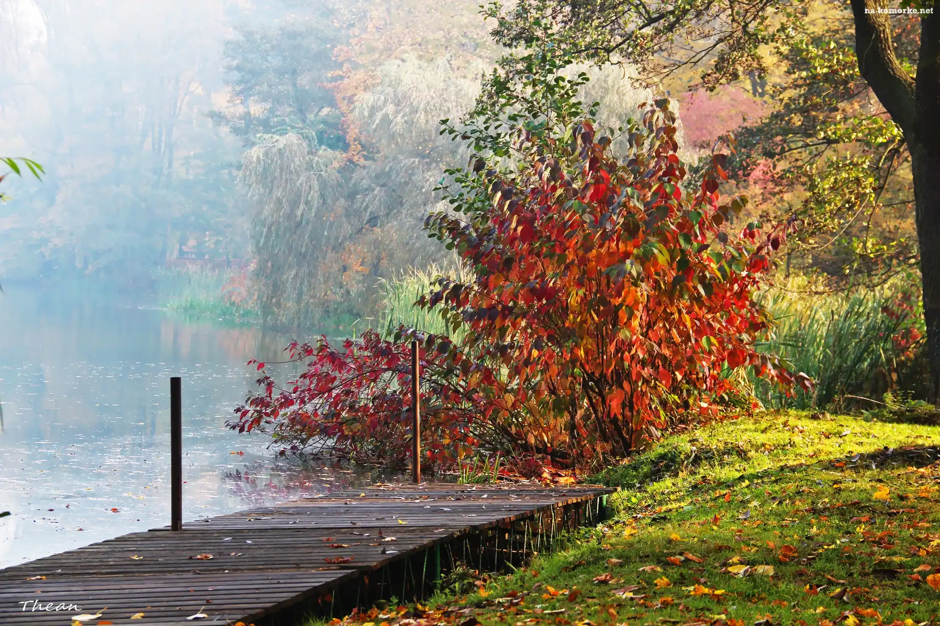 Drewniany, Kolorowe, Liście, Pomost, Jezioro, Mgła, Jesień na Komórkę