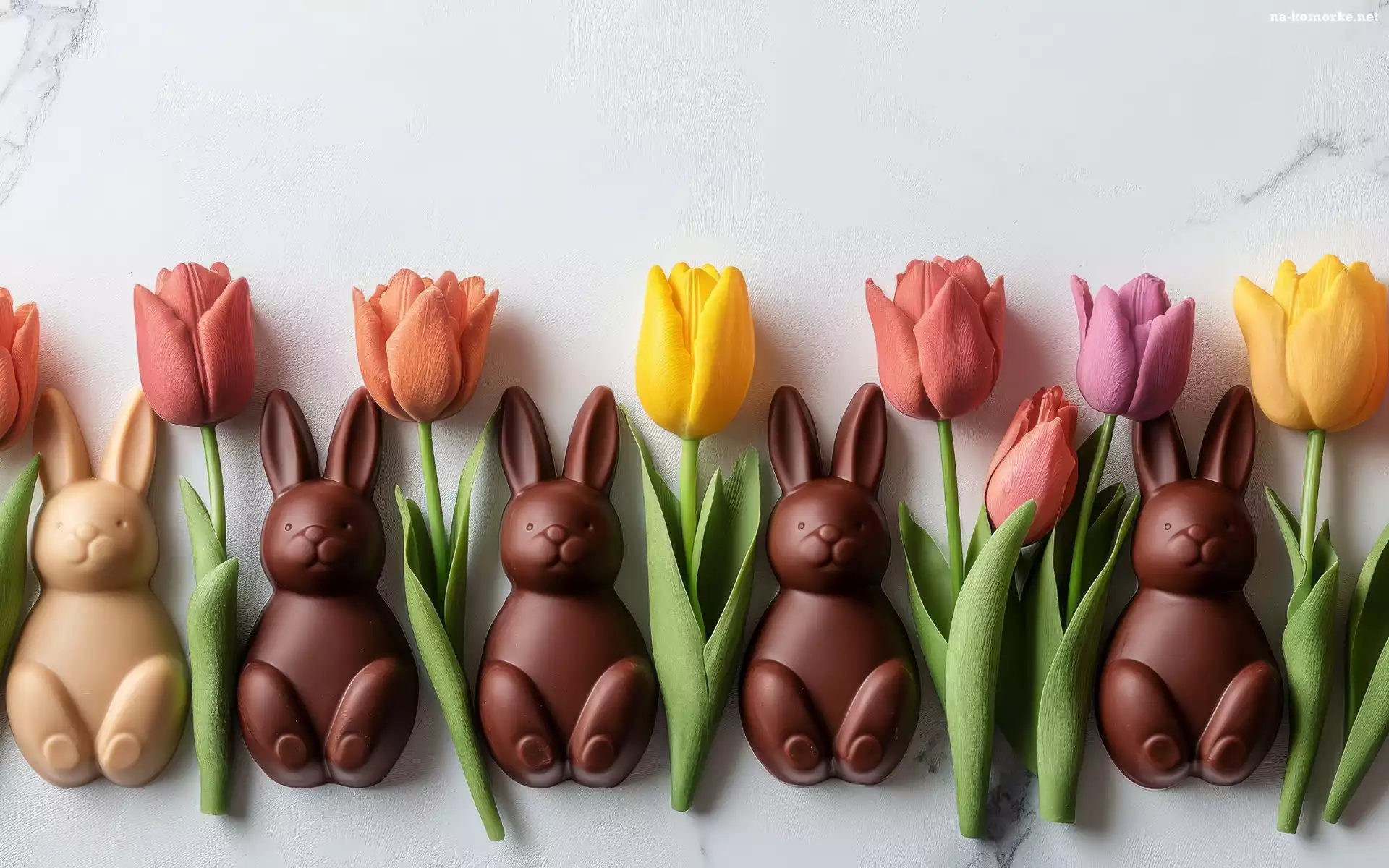 Tulipany, Tło, Króliki, Kwiaty, Białe, Kompozycja, Czekoladowe, Kolorowe na Komórkę