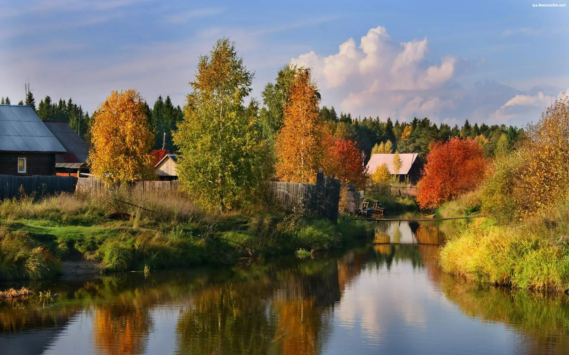 Kolorowe, Zabudowania, Rzeczka, Jesień, Las, Drzewa na Komórkę