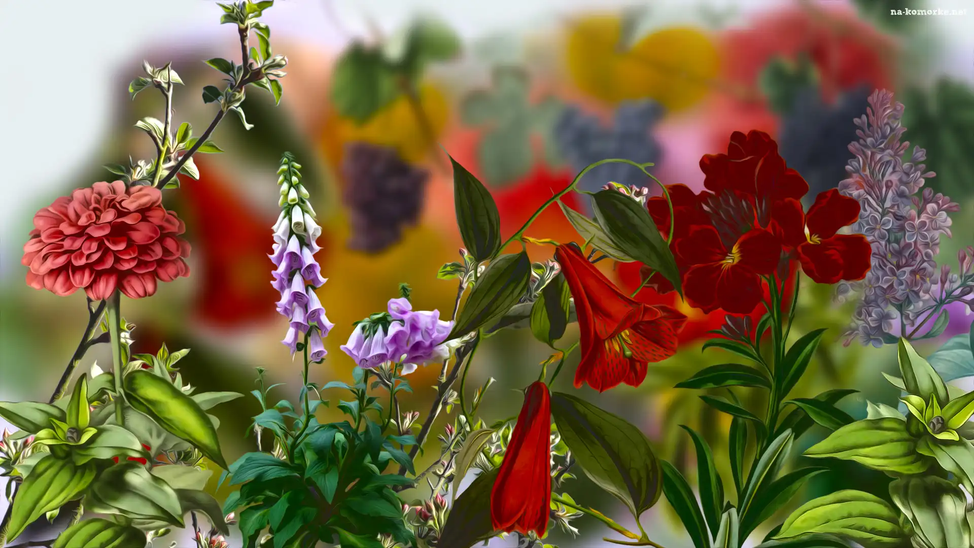 Abstrakcja, Grafika, Komputerowa Rzędy, Kolorowych, Kwiatów Wazon, Przybranie, Tulipany Żurawka Kolorowe, Światełka Kolorowe, Flary Multikolorowa, Ścieżka Niebieskie, Wstęgi Granatowe, Figury, Naczynia Herbaciana, Rozwinięta, Róża Kolorowe, Serduszka Wrzos, Kamienie Ognisty, Smok Żółte, Niebieskie, Irysy