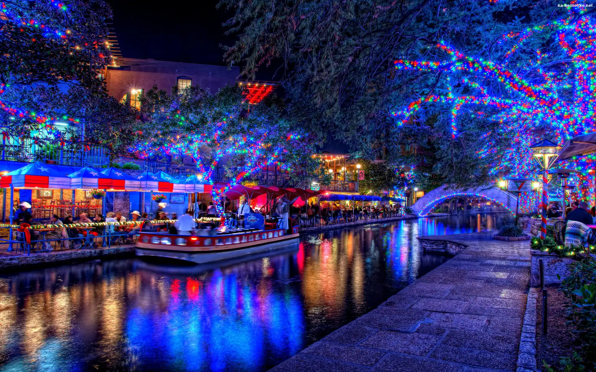 Teksas, San Antonio, Lampki, San Antonio River Walk, Domy, Kolorowe, River Walk, Park, Rzeka, Stany Zjednoczone na Komórkę |