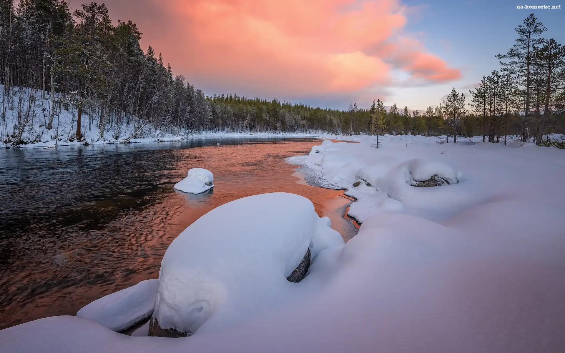 Obwód murmański, Zima, Drzewa, Rosja, Zaspy, Rzeka Kolvitsa na Komórkę