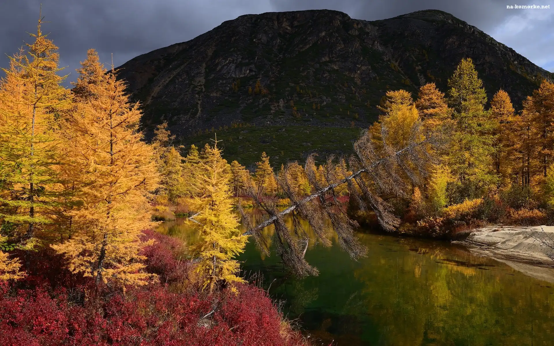 Rzeka, Jesień, Drzewa, Purga, Rosja, Góry, Magadan, Pożółkłe, Kołyma na Komórkę
