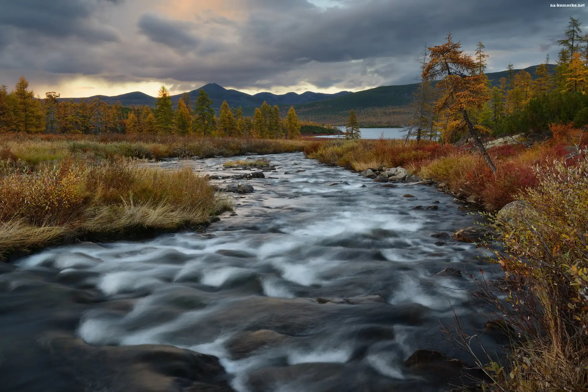 Rzeka Nevedomyy, Obwód magadański, Drzewa, Rosja, Góry, Trawy, Chmury, Kołyma na Komórkę