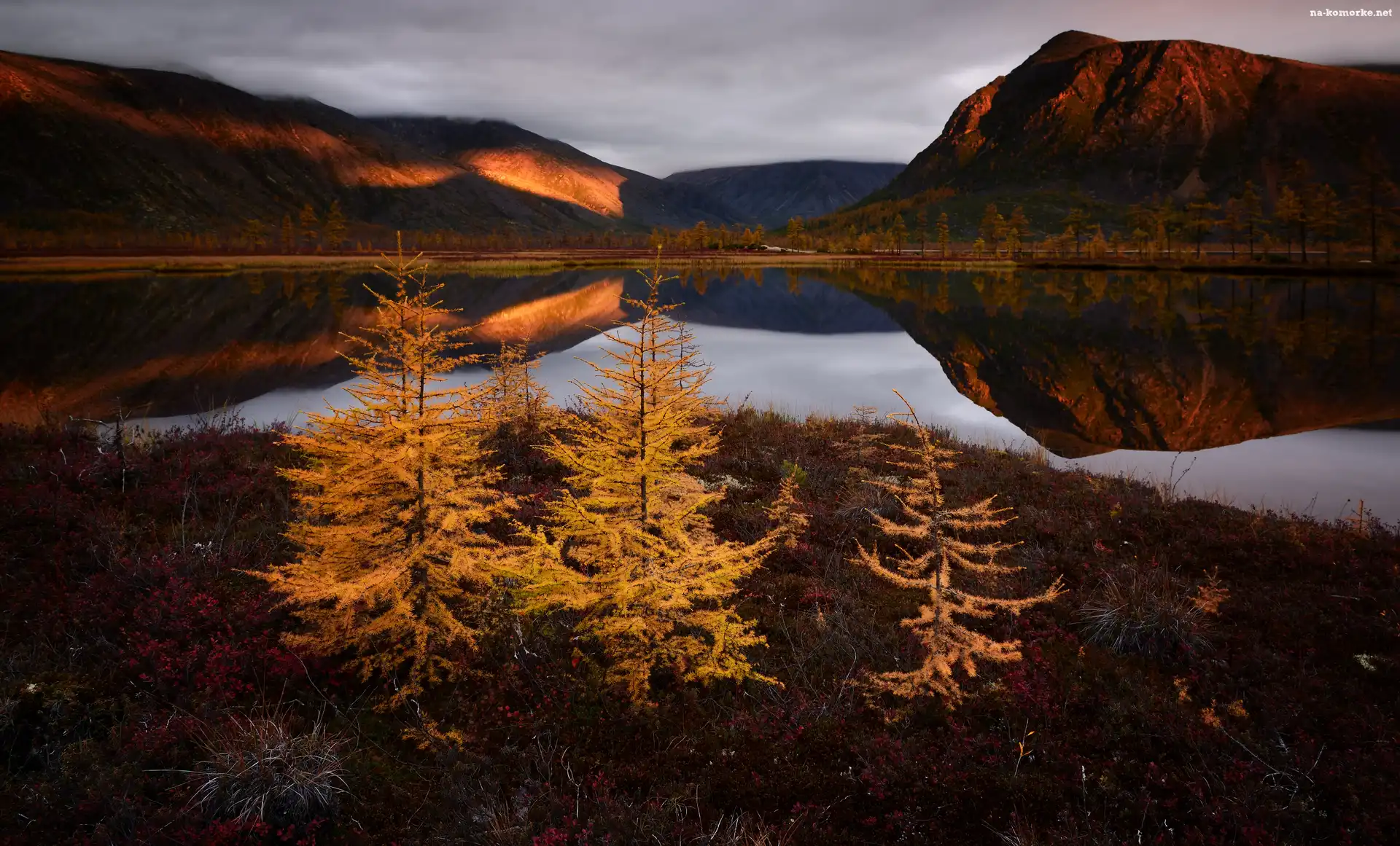 Jesień, Obwód magadański, Rosja, Góry, Jezioro Jack London, Drzewka, Kołyma na Komórkę
