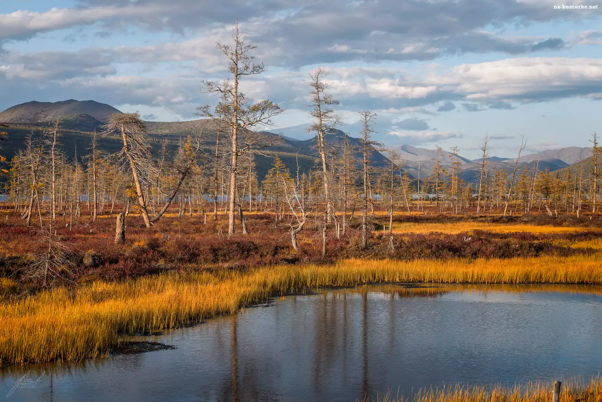 Jesień, Obwód magadański, Drzewa, Rosja, Góry, Rzeka, Drzewa, Kołyma na Komórkę