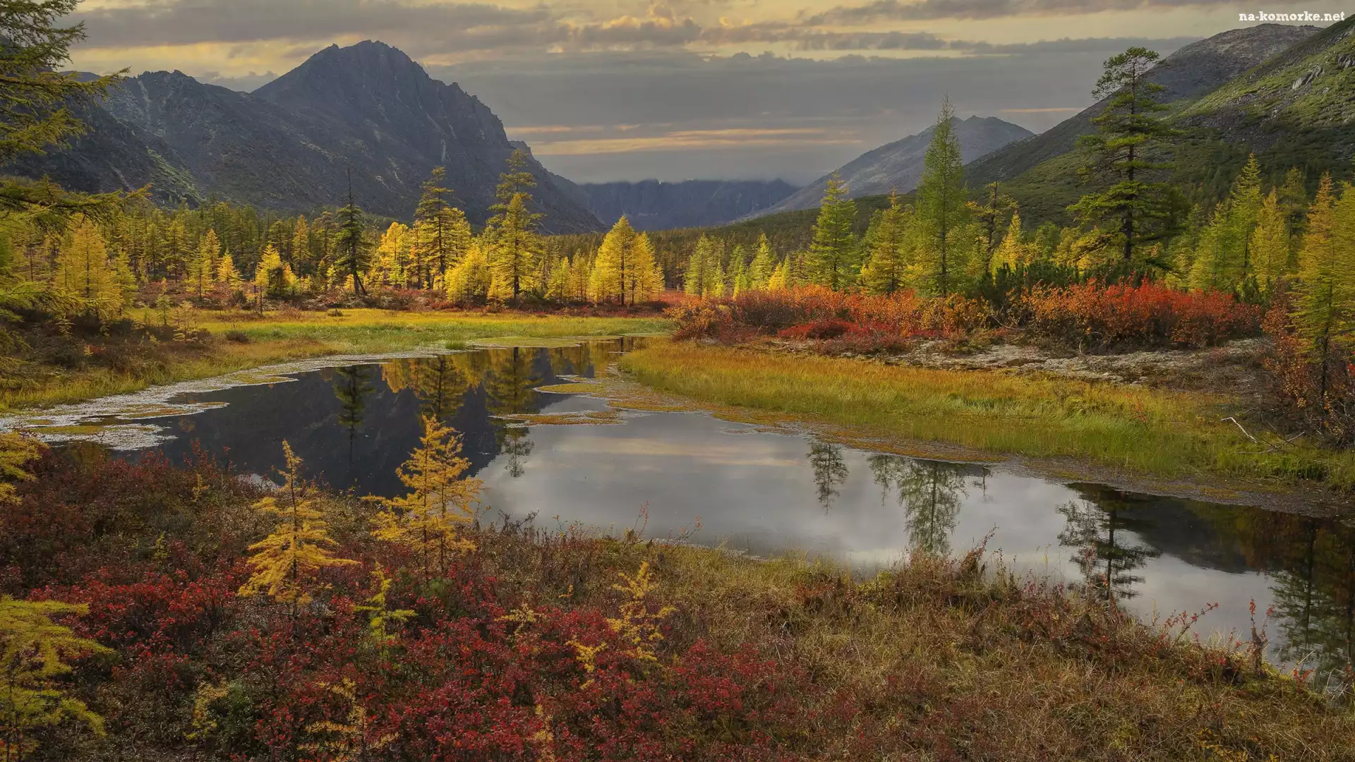 Kołyma, Strumień, Góry, Krzewy, Las, Jesień, Drzewa, Kolorowe, Pożółkłe, Rosja na Komórkę