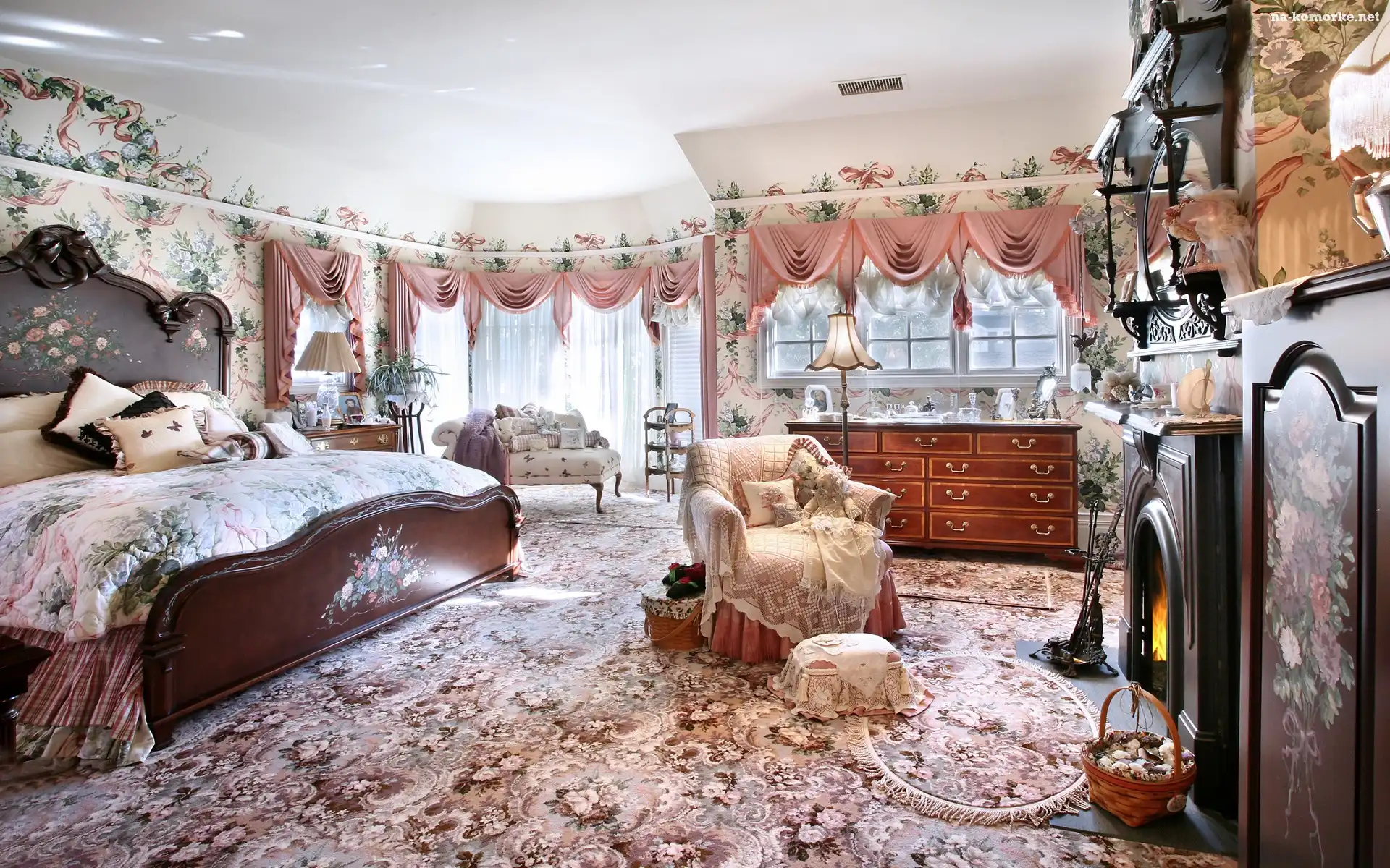 Sypialnia, Kominek, Zasłony, Łoże, Fotel, Dywany, Komoda na Komórkę