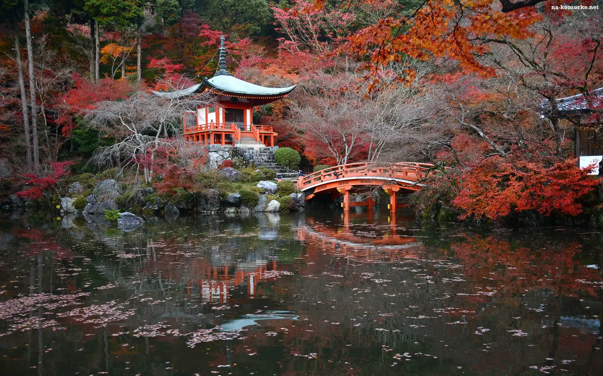 Kompleks świątynny Daigo-ji, Kioto, Mostek, Japonia, Świątynia Benten-do, Staw, Jesień, Drzewa na Komórkę |