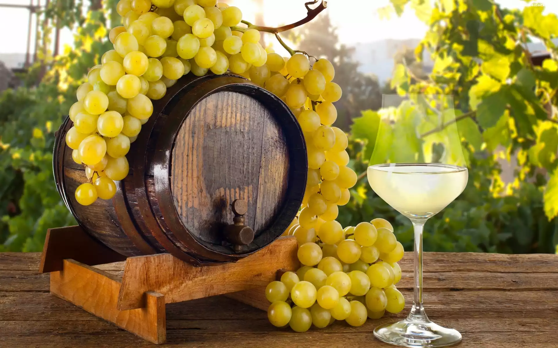 Kompozycja, Kiść, Winogron, Beczułka, Kieliszek na Komórkę