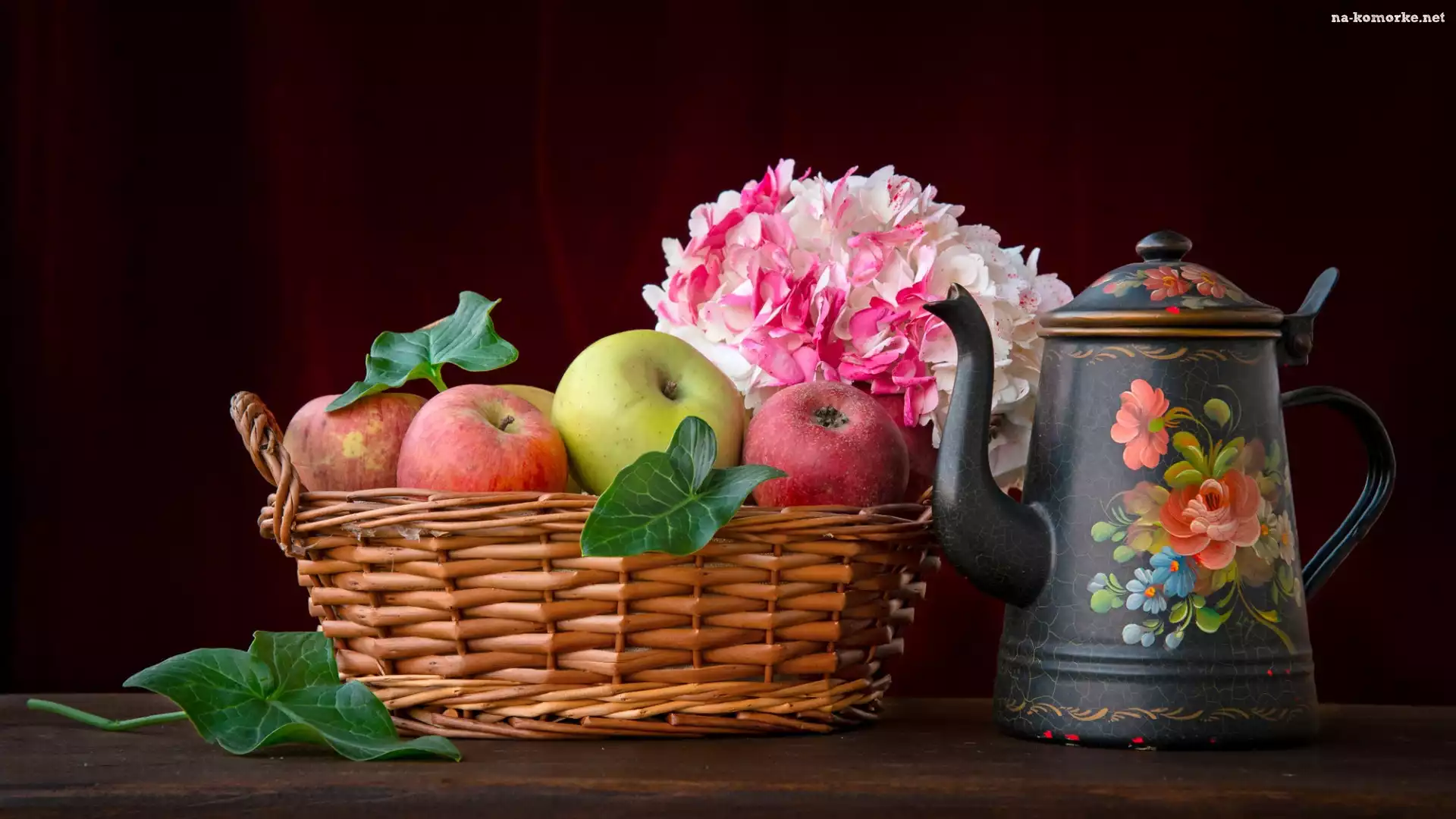 Liście, Jabłka, Hortensja, Kompozycja, Koszyk, Dzbanek na Komórkę