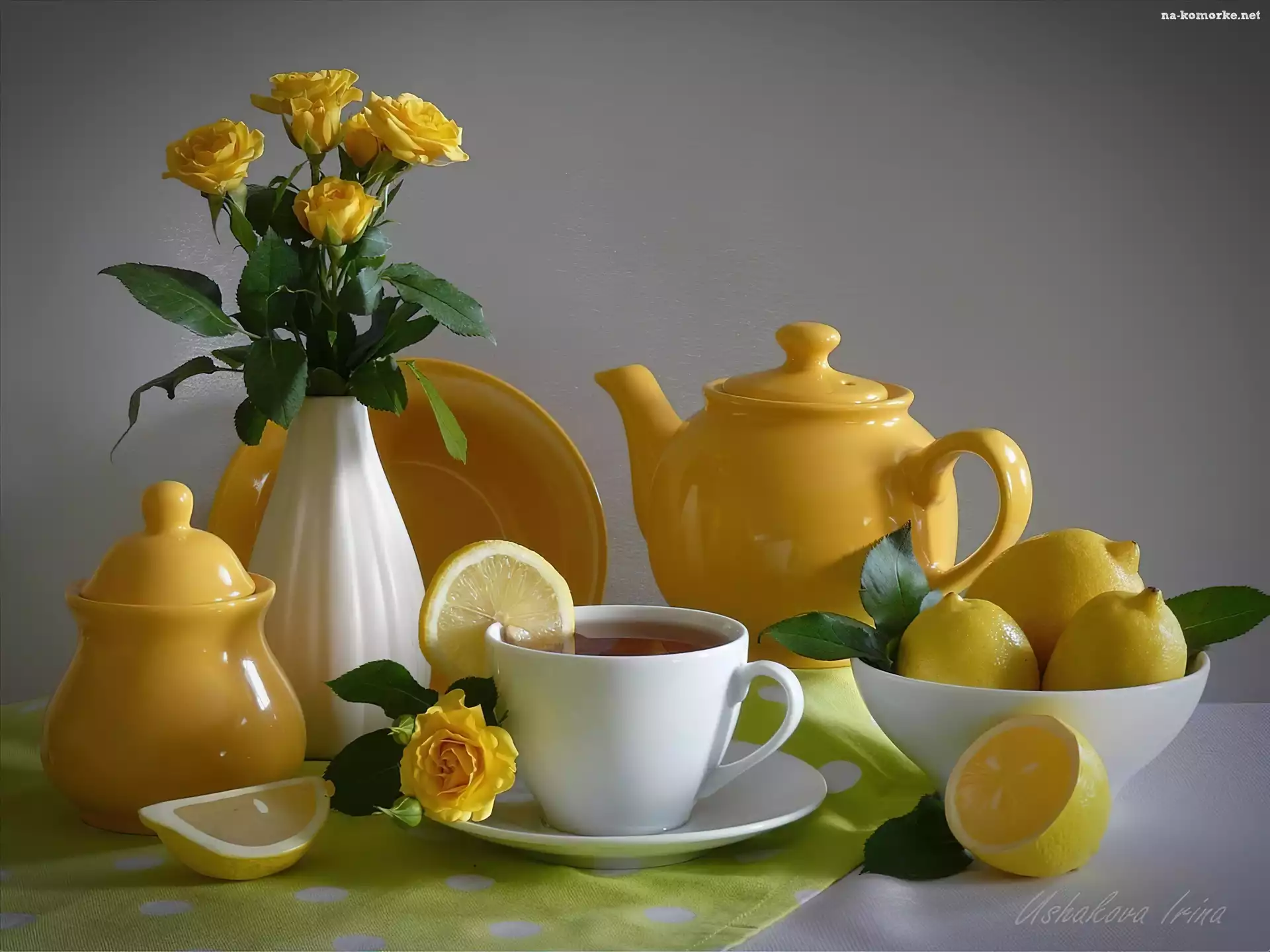 Kompozycja, Cytryny, Filiżanka, Czajnik na Komórkę