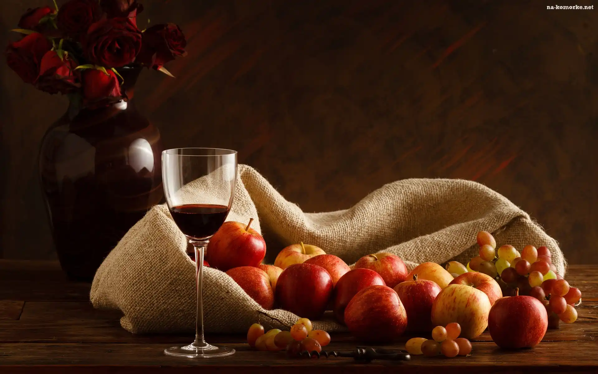 Kompozycja, Jabłka, Winogrona, Lampka, Wina na Komórkę
