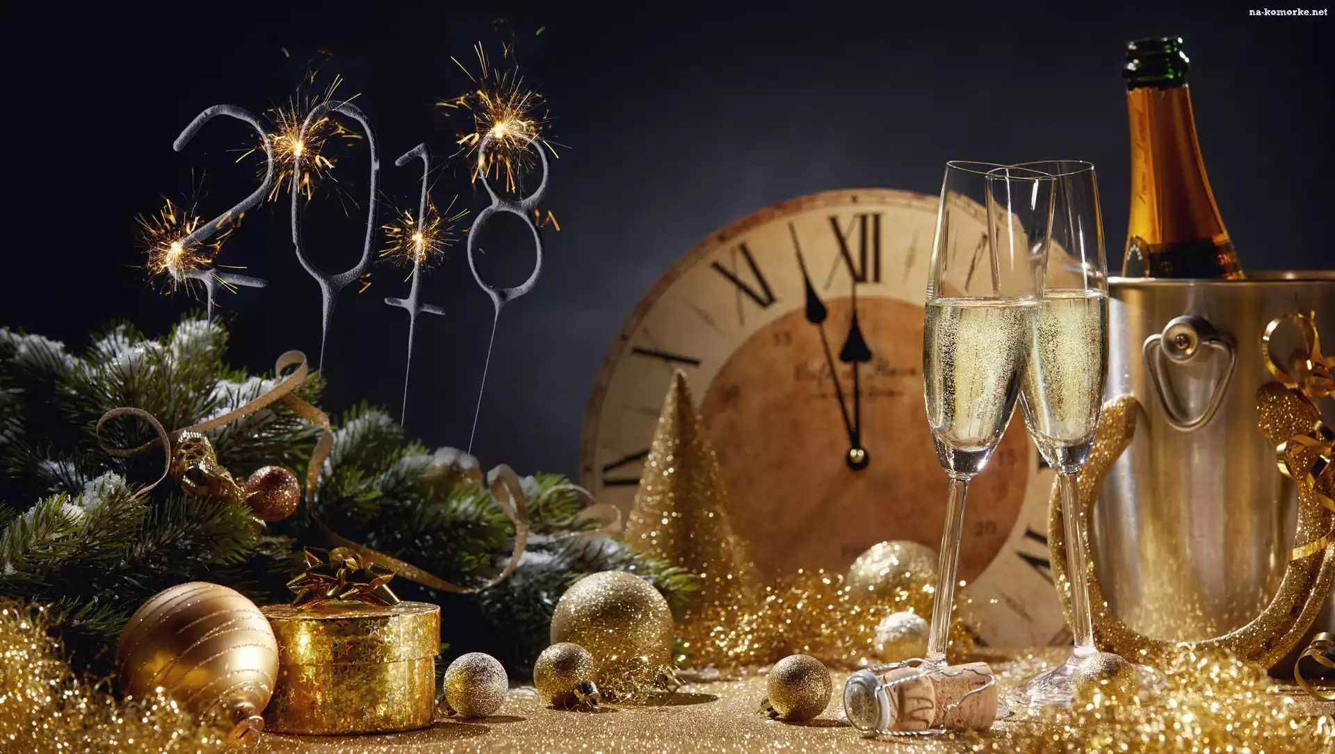 Kompozycja, Zegar, Wiaderko, Szampan, Sylwester, Bombki, Nowy Rok, Kieliszki, 2018, Gałązki, Zimne ognie na Komórkę |