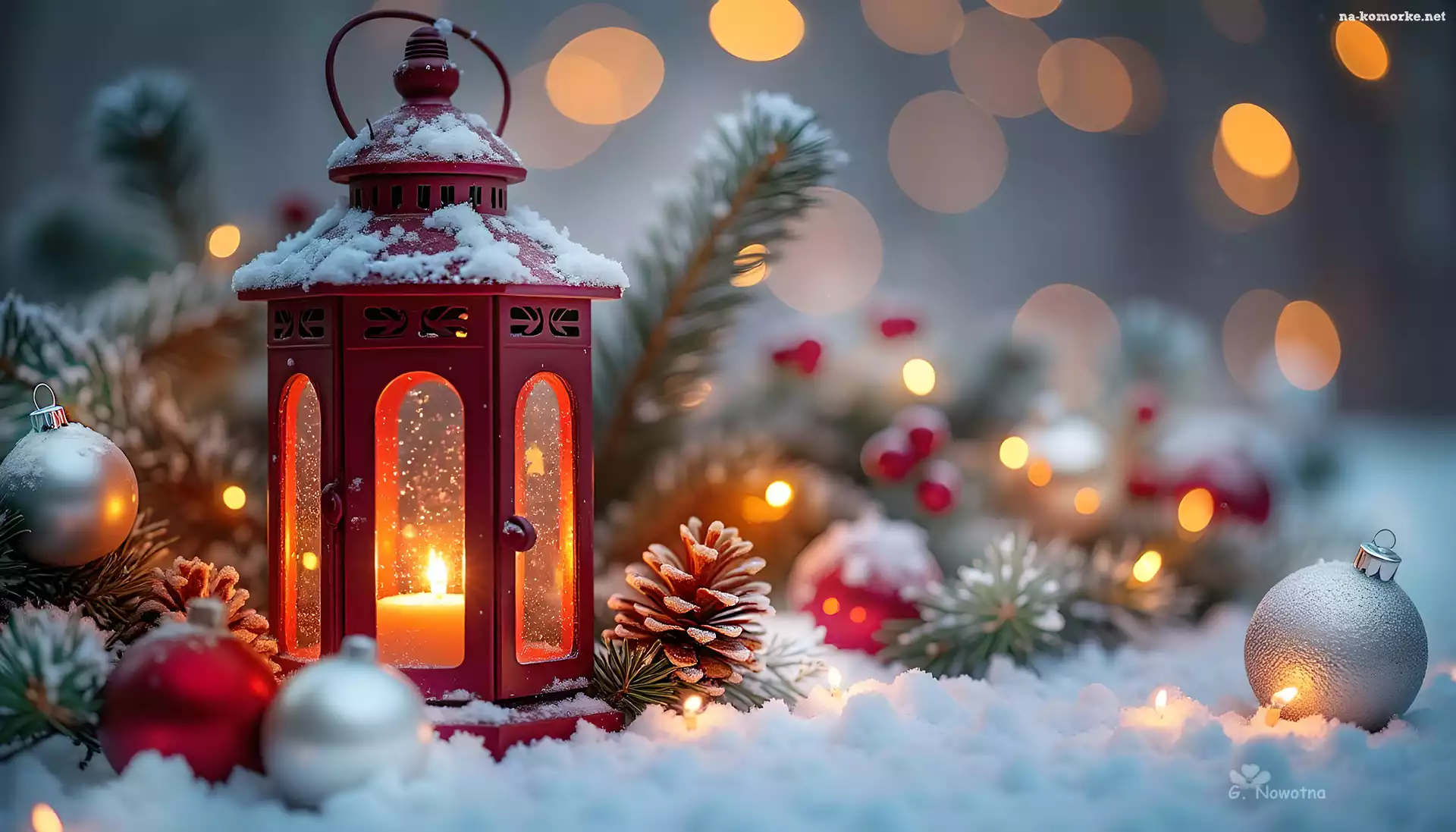 Grafika, Lampion, Śnieg, Kompozycja, Bombki, Szyszki na Komórkę