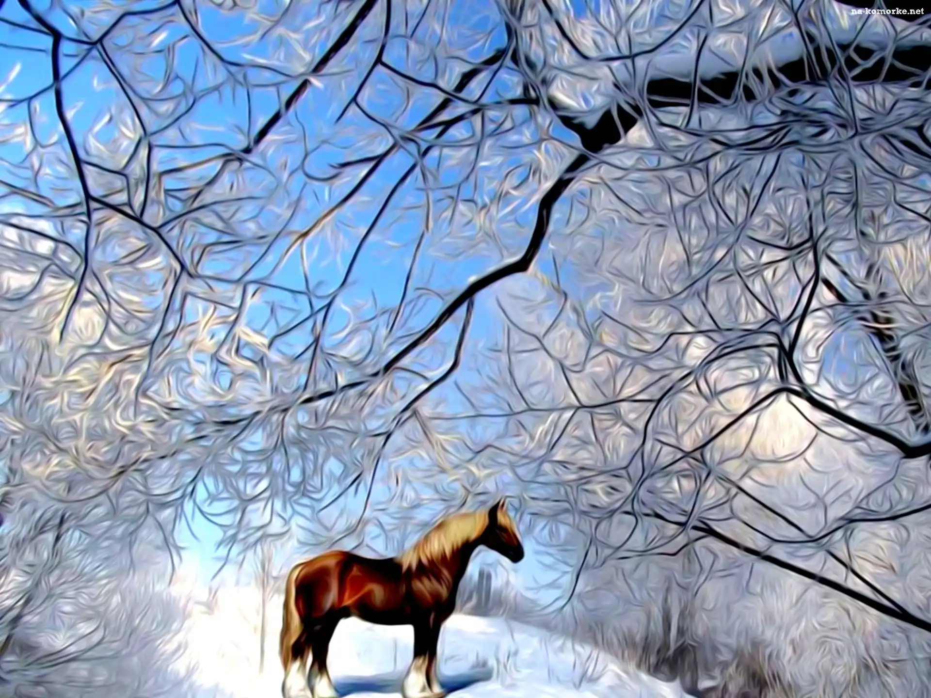Komputerowa, Koń, Zima, Drzewa, Grafika na Komórkę