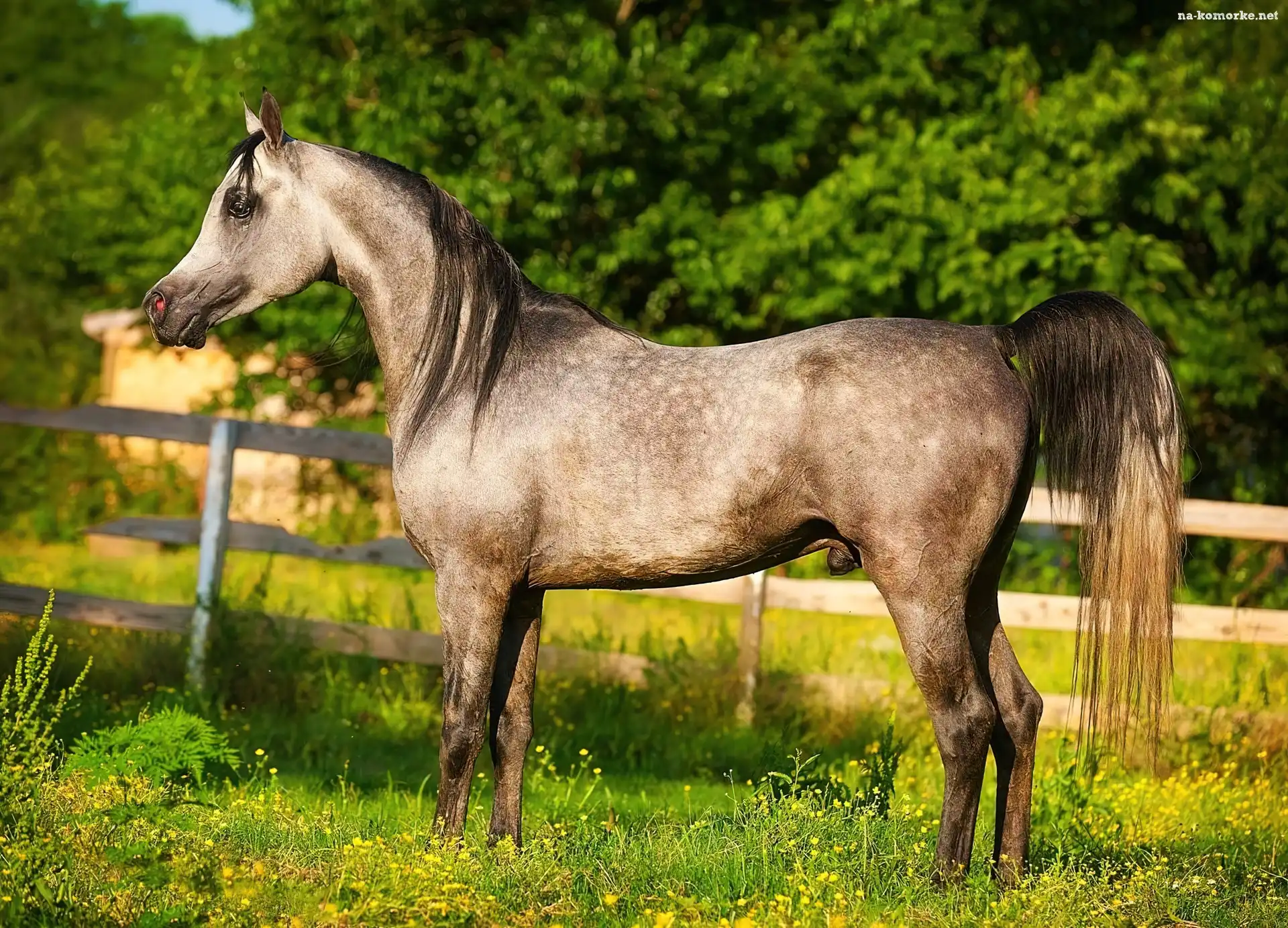 Koń, Drzewa, Łąka, Ogrodzenie na Komórkę
