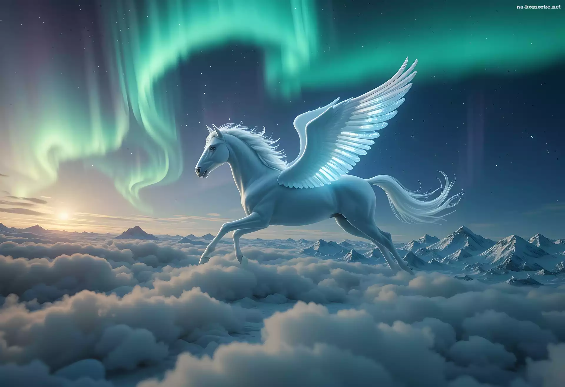 Pegaz, Zorza polarna, Fantasy, Chmury, Biały, Skrzydła, Koń na Komórkę