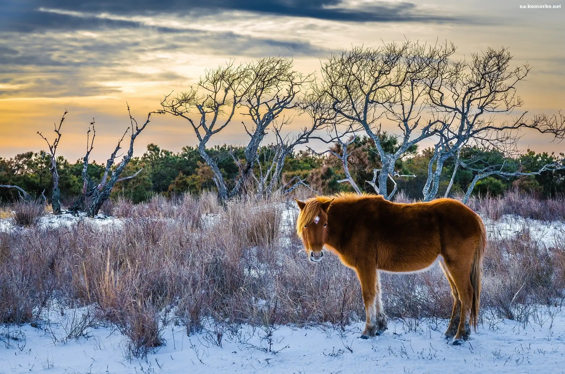 Koń, Śnieg, Trawy, Drzewa na Komórkę