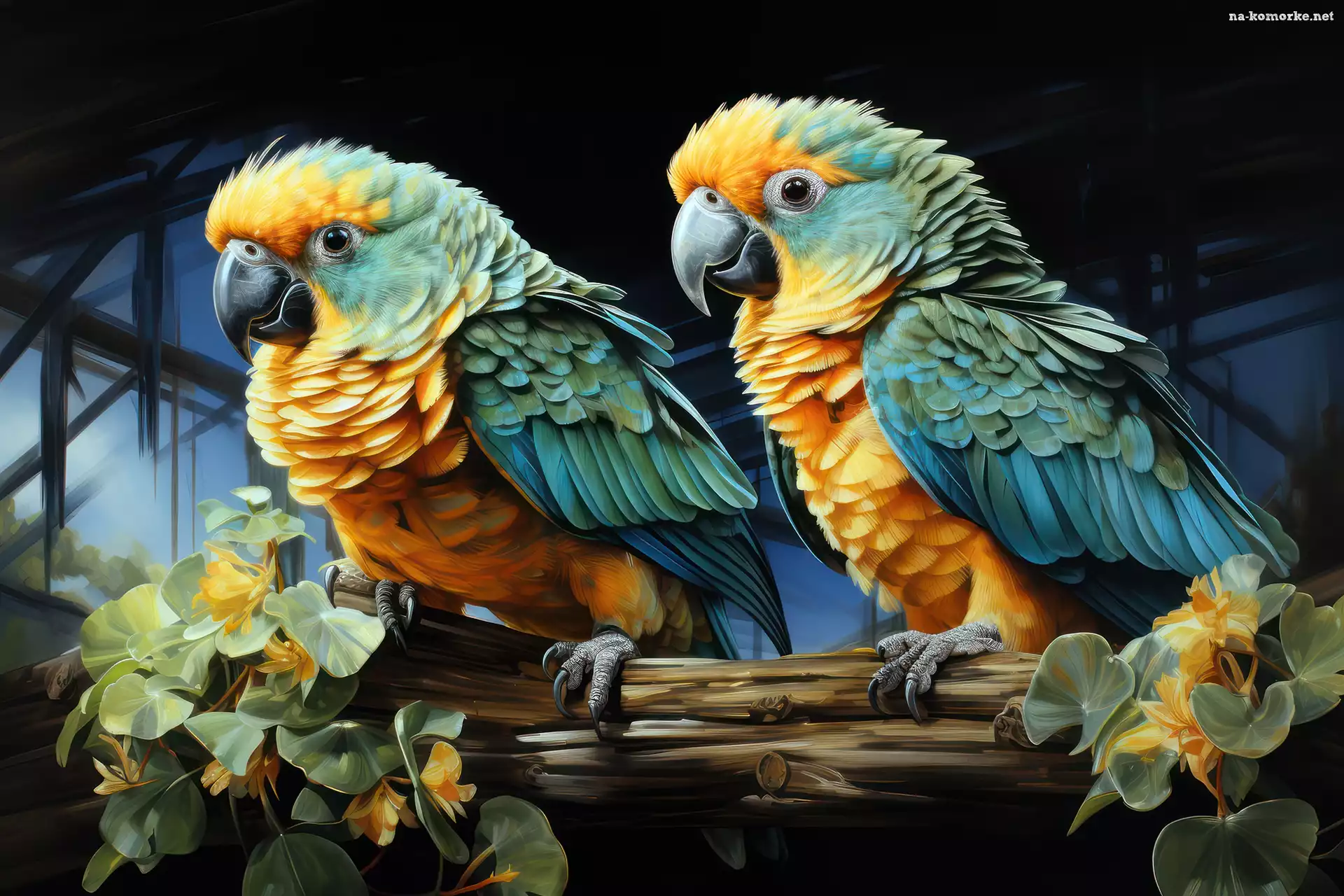 Dwie, Konar, Kwiaty, Papugi, Grafika na Komórkę