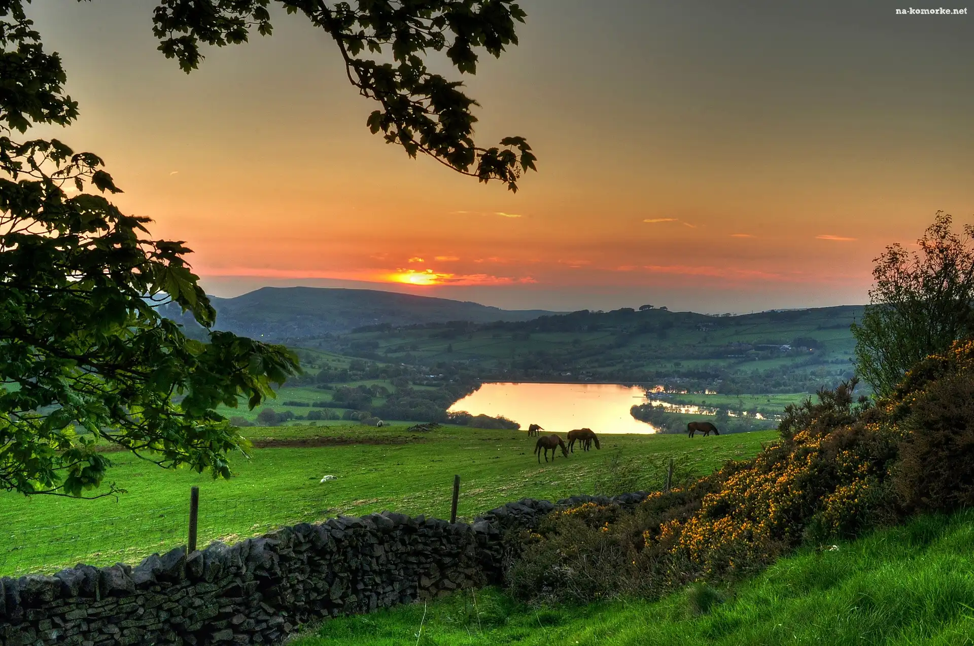 Konie, Góry, Rzeka, Słońca, Łąki, Zachód na Komórkę