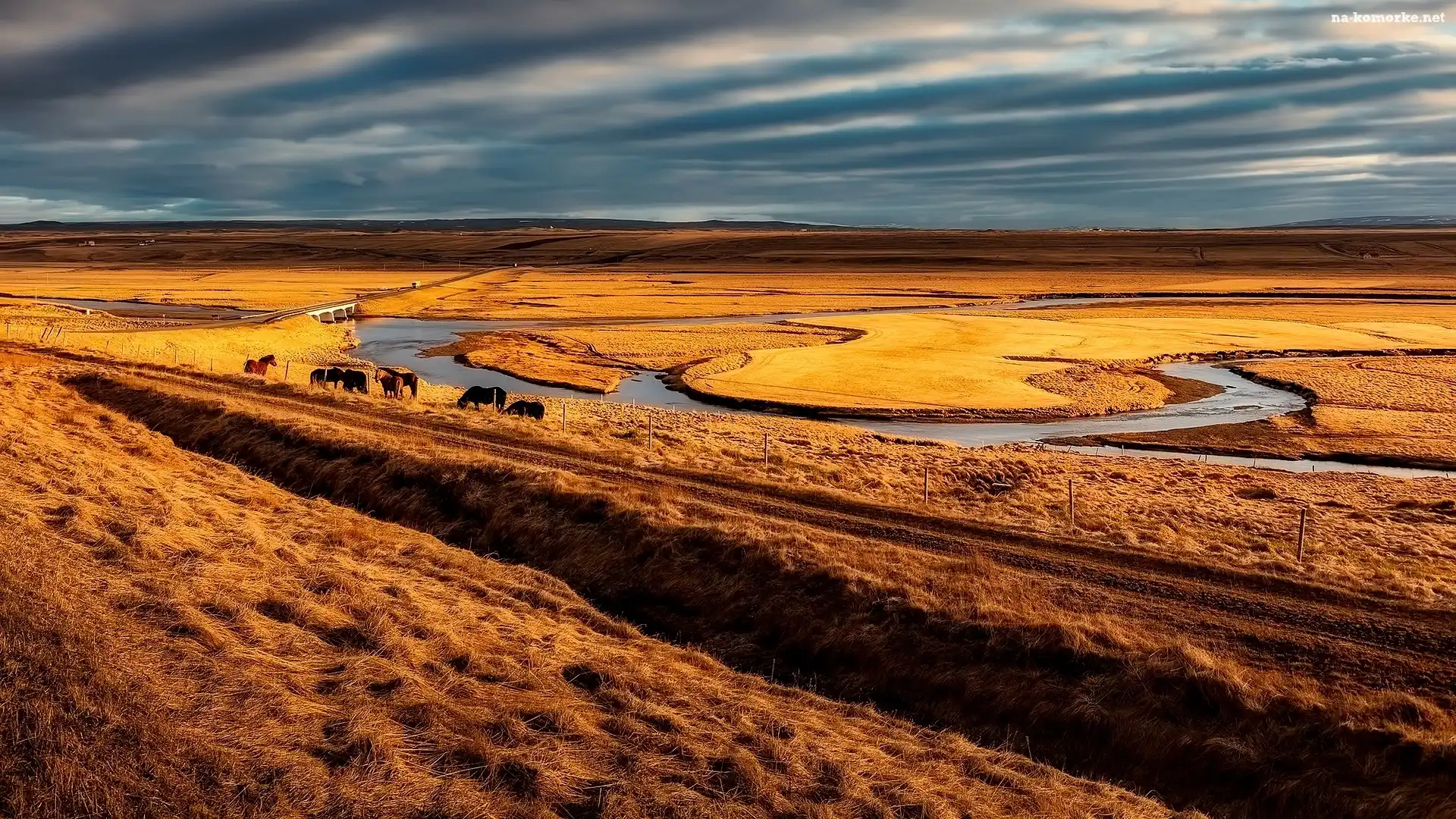 Konie, Pola, Łąki, Rzeka, Most na Komórkę