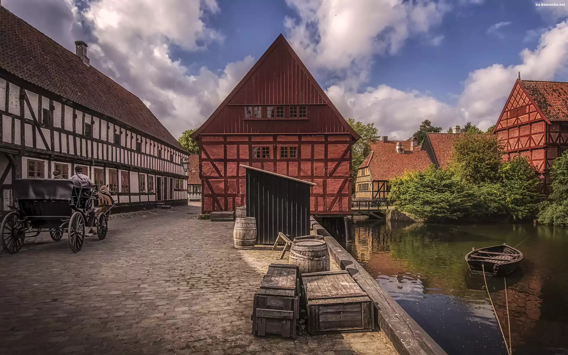 Dania, Beczki, Domy, Skrzynie, Miasto Aarhus, Rzeka, Łódka, Wóz konny na Komórkę