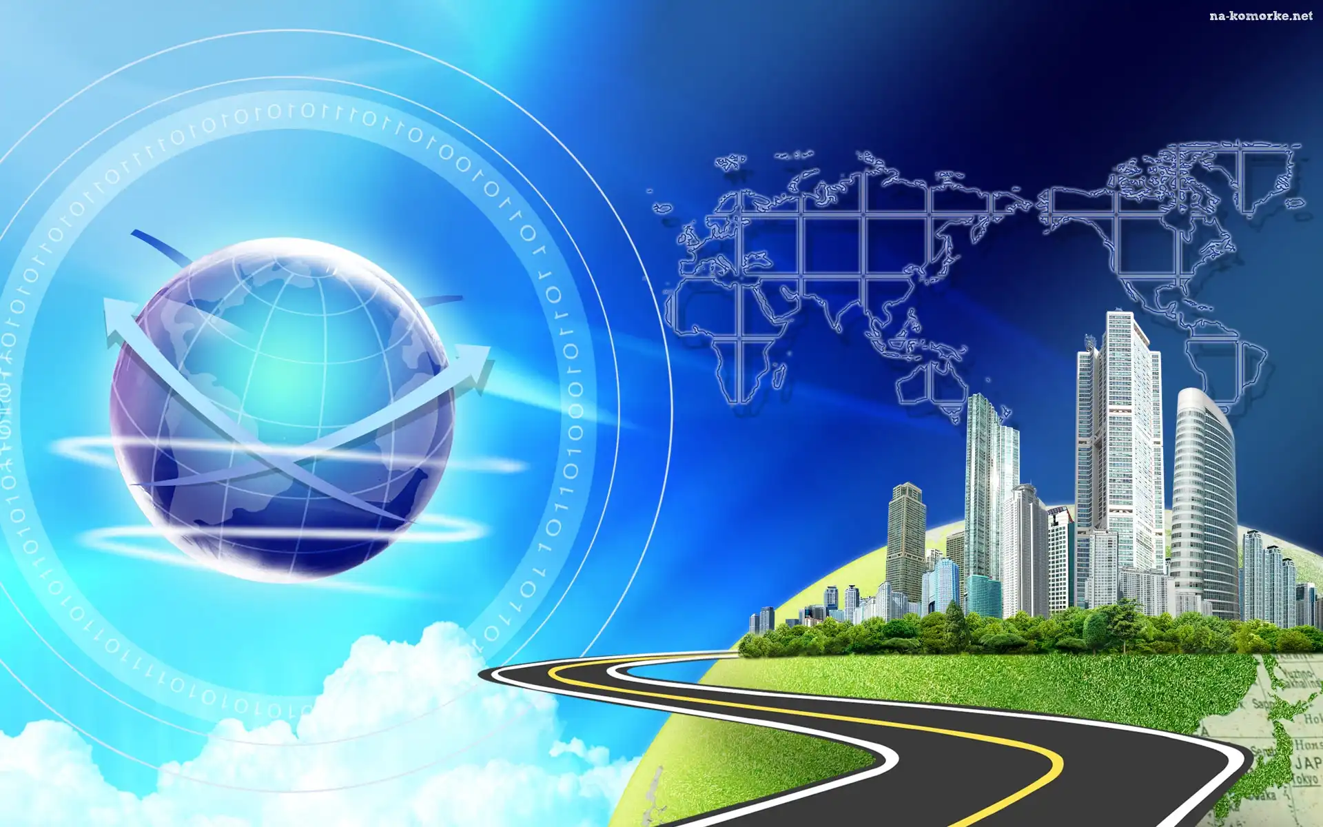 Kontynenty, Droga, Globus, Niebo, Wieżowce na Komórkę