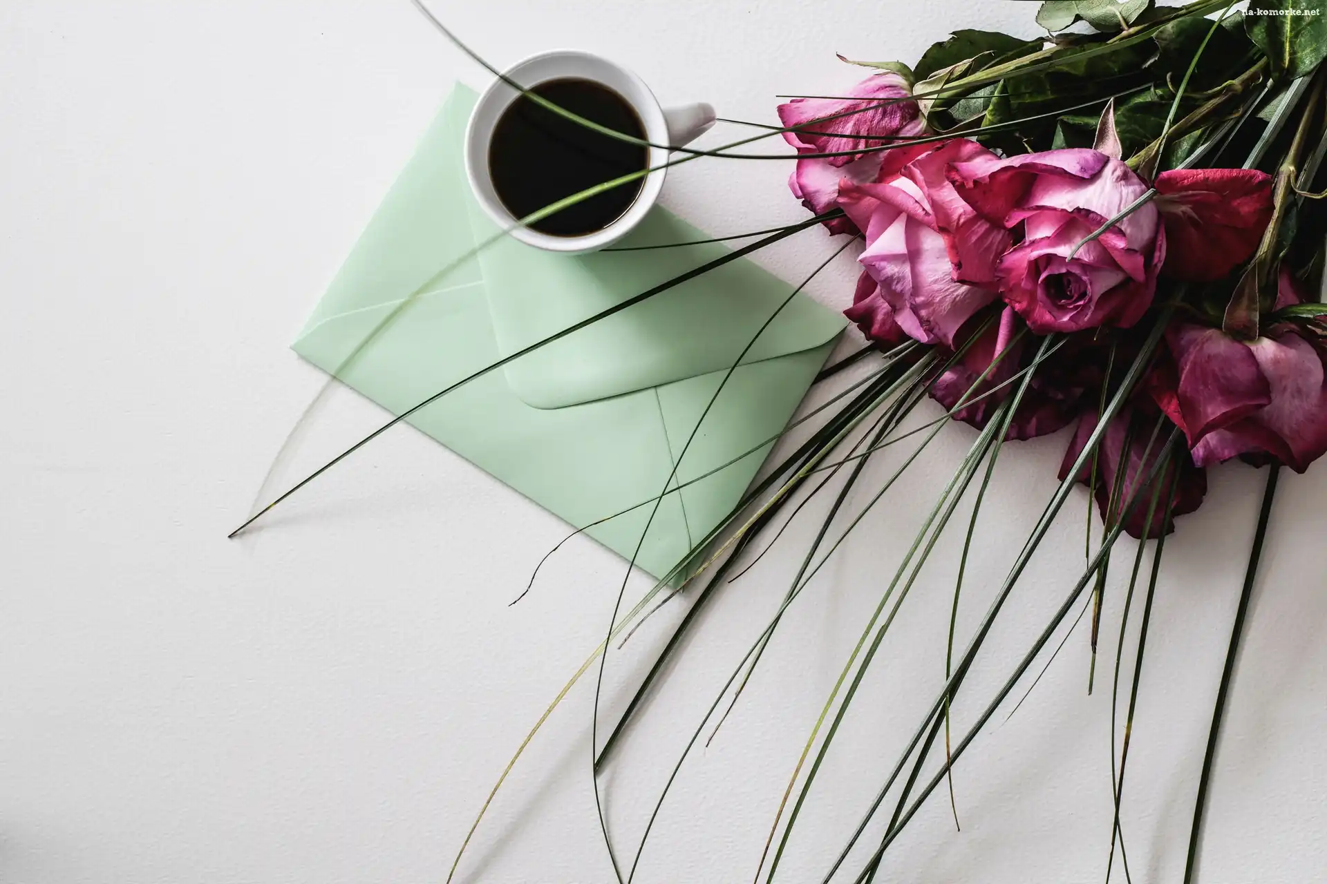 Koperta, Kawa, Filiżanka, Bukiet, Róże na Komórkę
