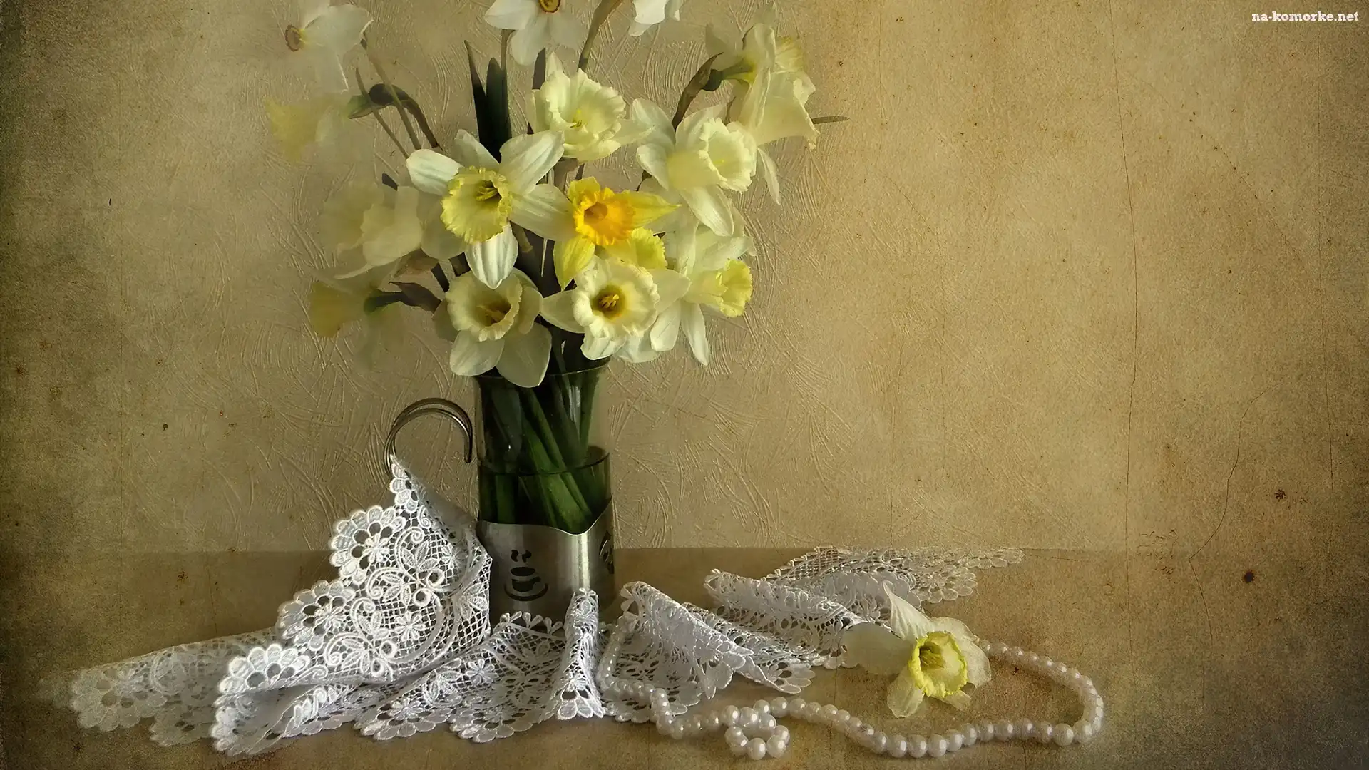 Koronka, Wazon, Żółte, Żonkile, Perły na Komórkę
